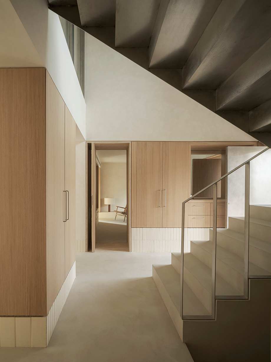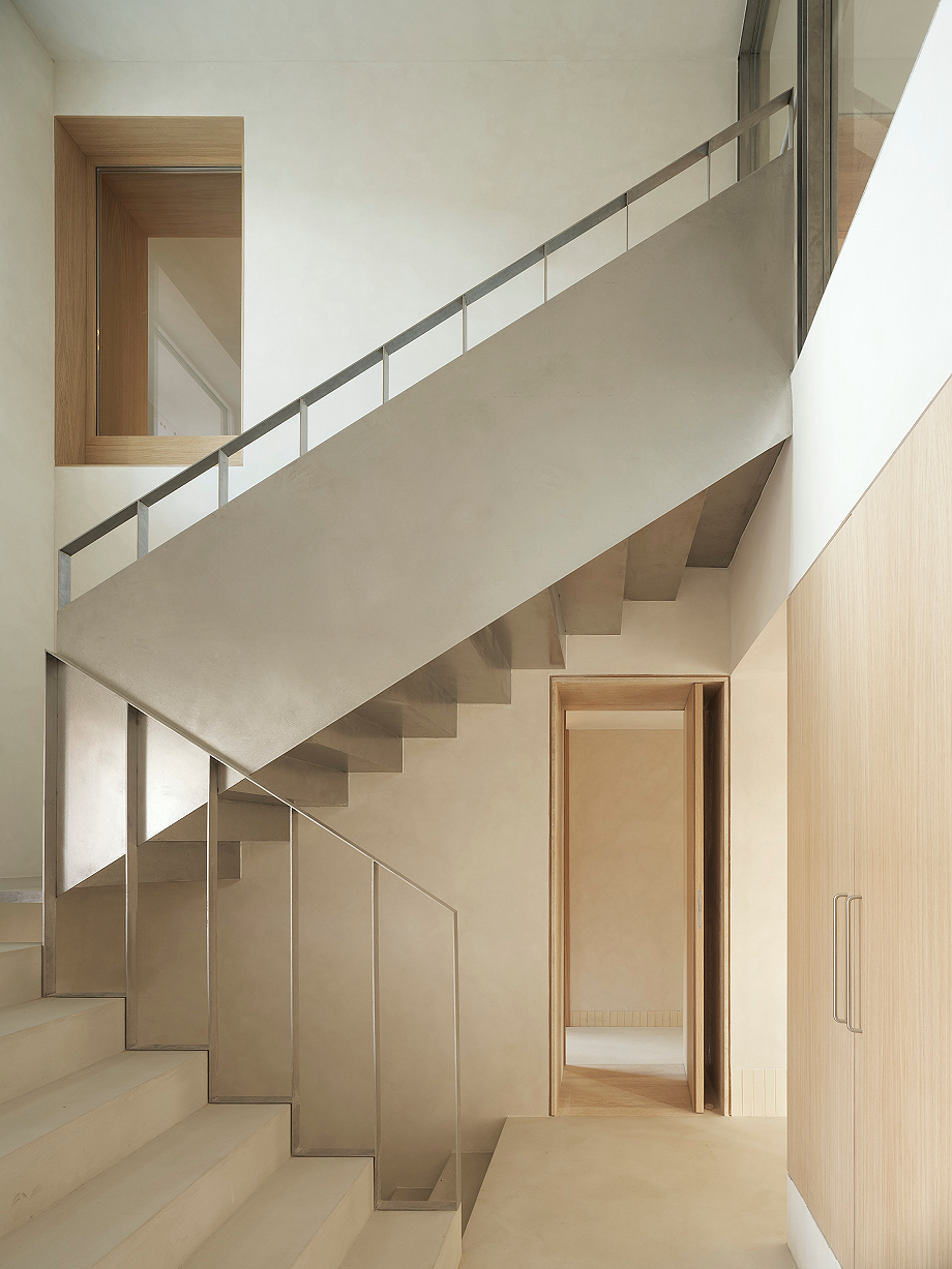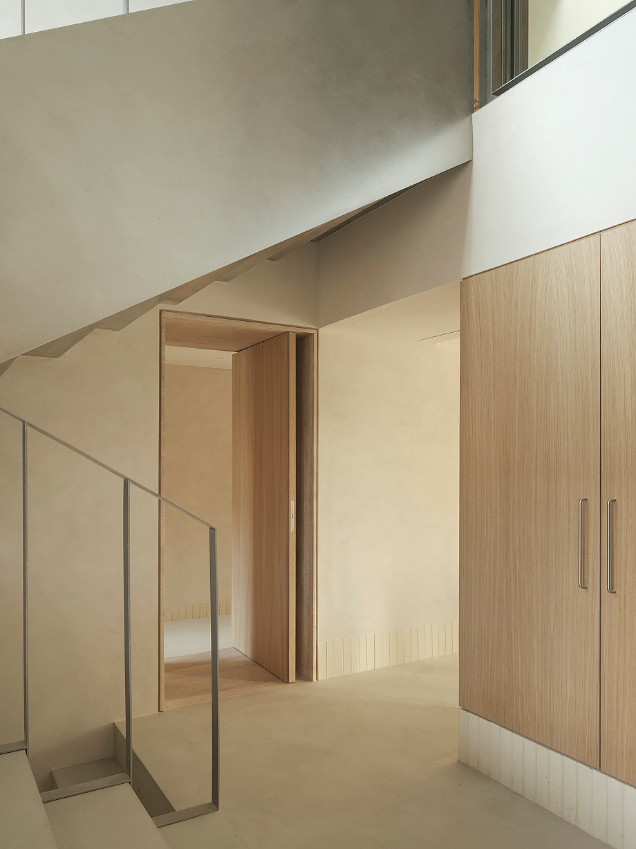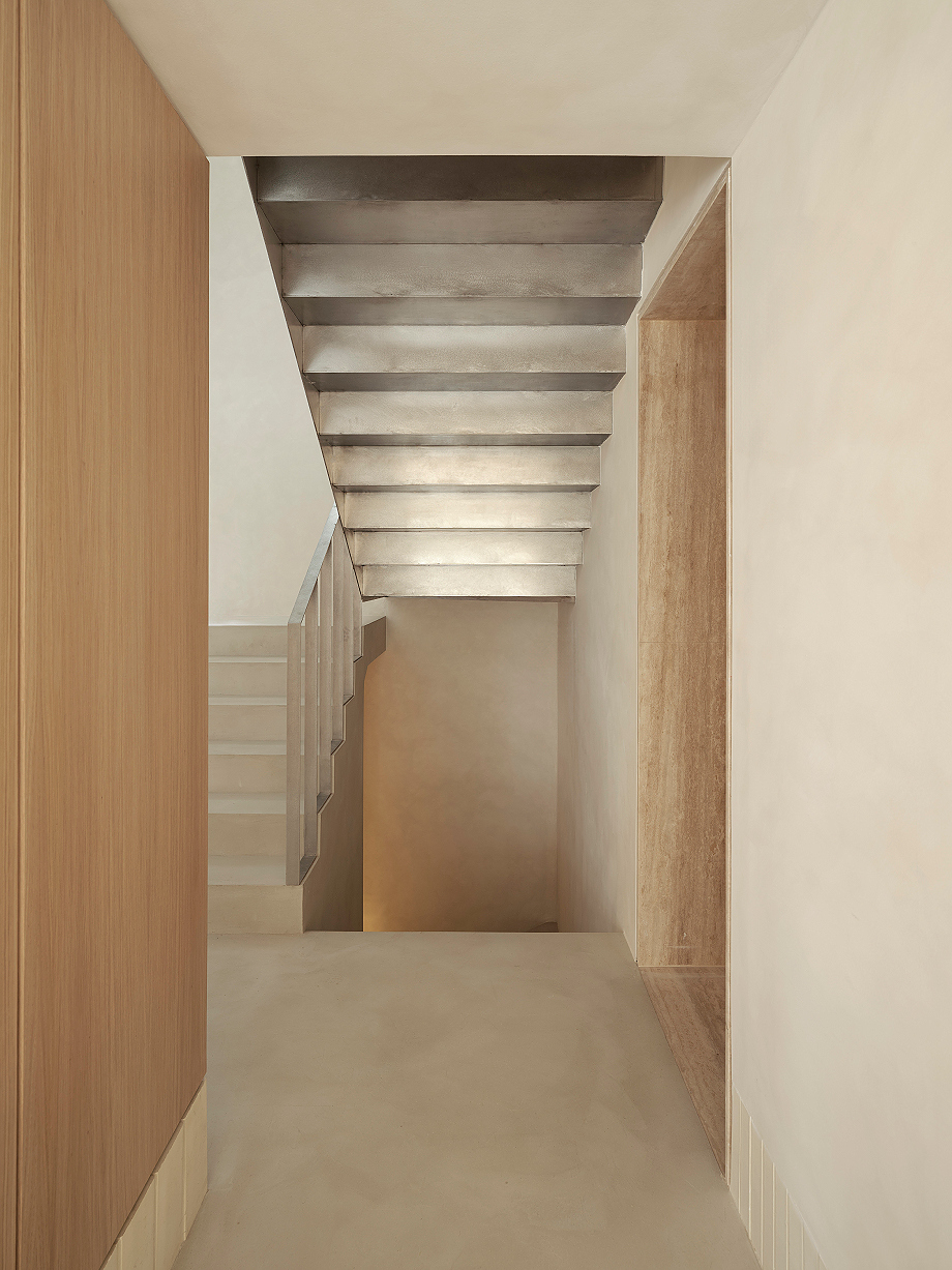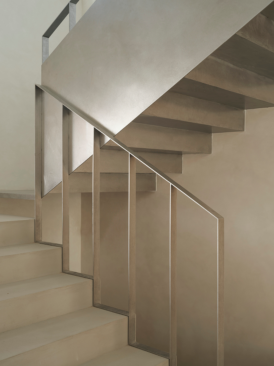 Estéticamente, la mezcla de tonalidades neutras y ocres crea una atmósfera de serenidad que acerca la casa a los ideales mediterráneos. El versátil ladrillo funciona como hilo conductor de la narrativa del proyecto, ayudando a construir tanto el contenido como el continente de la vivienda. Su expresividad imparte carácter a cada ambiente, combinándose con otros elementos naturales como la madera de roble y el mármol Travertino. Una imponente escalera, realizada en acero inoxidable, conecta los diferentes pisos y preside el vestíbulo de entrada, recibiendo a moradores y visitantes.