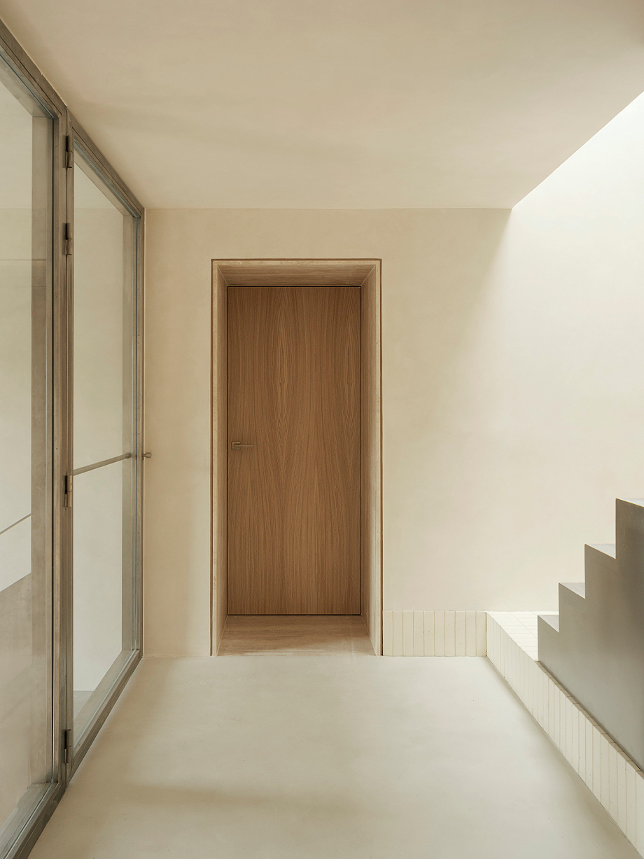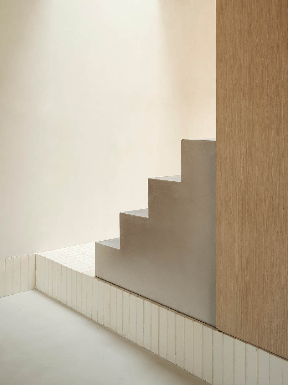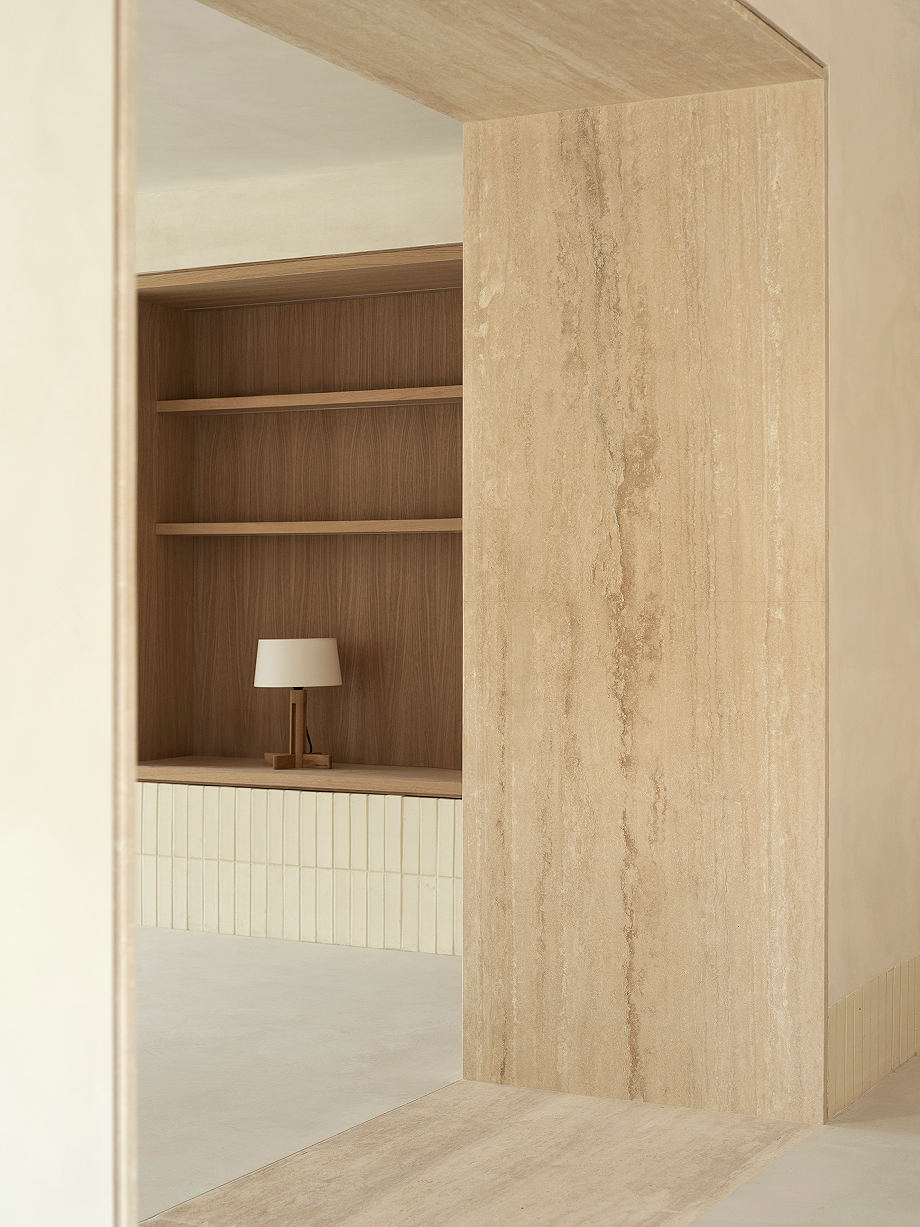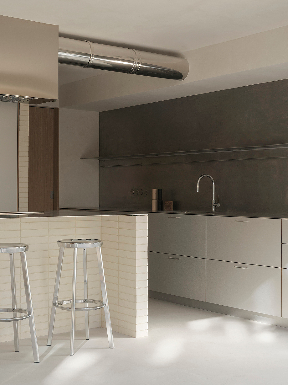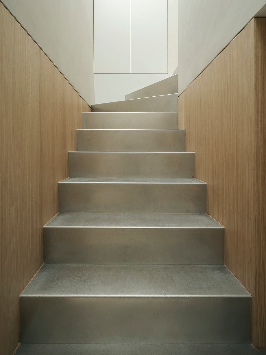 Estéticamente, la mezcla de tonalidades neutras y ocres crea una atmósfera de serenidad que acerca la casa a los ideales mediterráneos. El versátil ladrillo funciona como hilo conductor de la narrativa del proyecto, ayudando a construir tanto el contenido como el continente de la vivienda. Su expresividad imparte carácter a cada ambiente, combinándose con otros elementos naturales como la madera de roble y el mármol Travertino. Una imponente escalera, realizada en acero inoxidable, conecta los diferentes pisos y preside el vestíbulo de entrada, recibiendo a moradores y visitantes.
