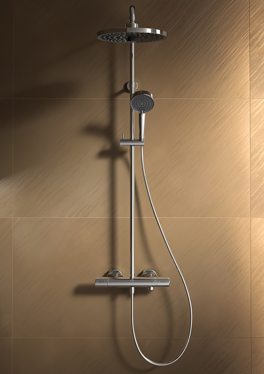 Ceratherm T25, recientemente renovada, representa una propuesta equilibrada entre funcionalidad, estética y sostenibilidad para el espacio de baño. Con un enfoque en el diseño contemporáneo, incorpora duchas fijas de mayor formato y un mezclador completamente cromado, cuyo cuerpo cilíndrico, limpio y minimalista, aporta un carácter elegante y sobrio al conjunto. Las manetas ergonómicas, equipadas con un botón cromado y superficie antideslizante, permiten un manejo cómodo y preciso. Además, la tecnología CoolBody mantiene la superficie siempre fría al tacto, ya que el agua caliente está rodeada por agua fría, evitando posibles quemaduras.