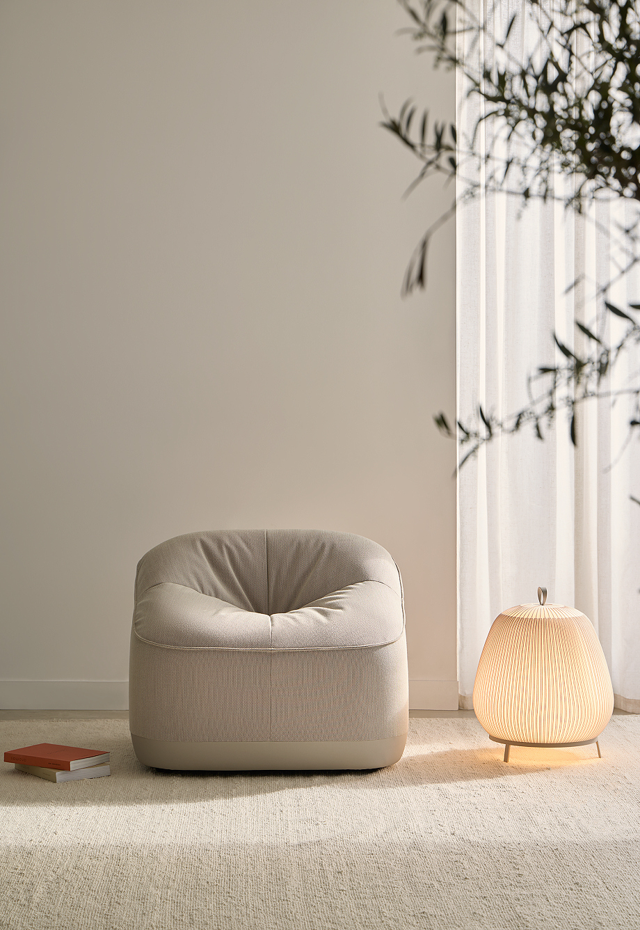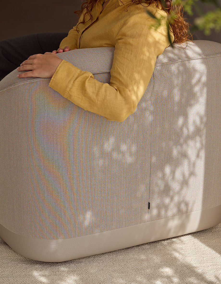 En esta nueva pieza del catálogo de Viccarbe, el tejido cobra un gran protagonismo: define volúmenes, crea transiciones visuales y genera una tensión calculada que acentúa la personalidad del diseño. Sus laterales lisos contrastan con la suavidad del asiento, rematado por una costura visible. En el centro, un nudo invisible genera una arruga natural que rompe la rigidez geométrica y aporta un efecto envolvente, casi escultórico.