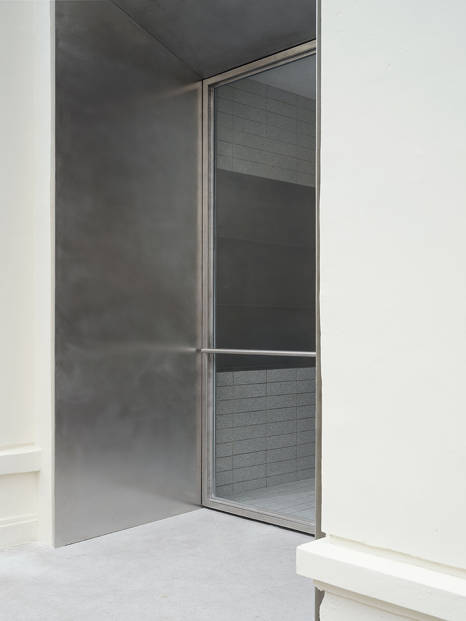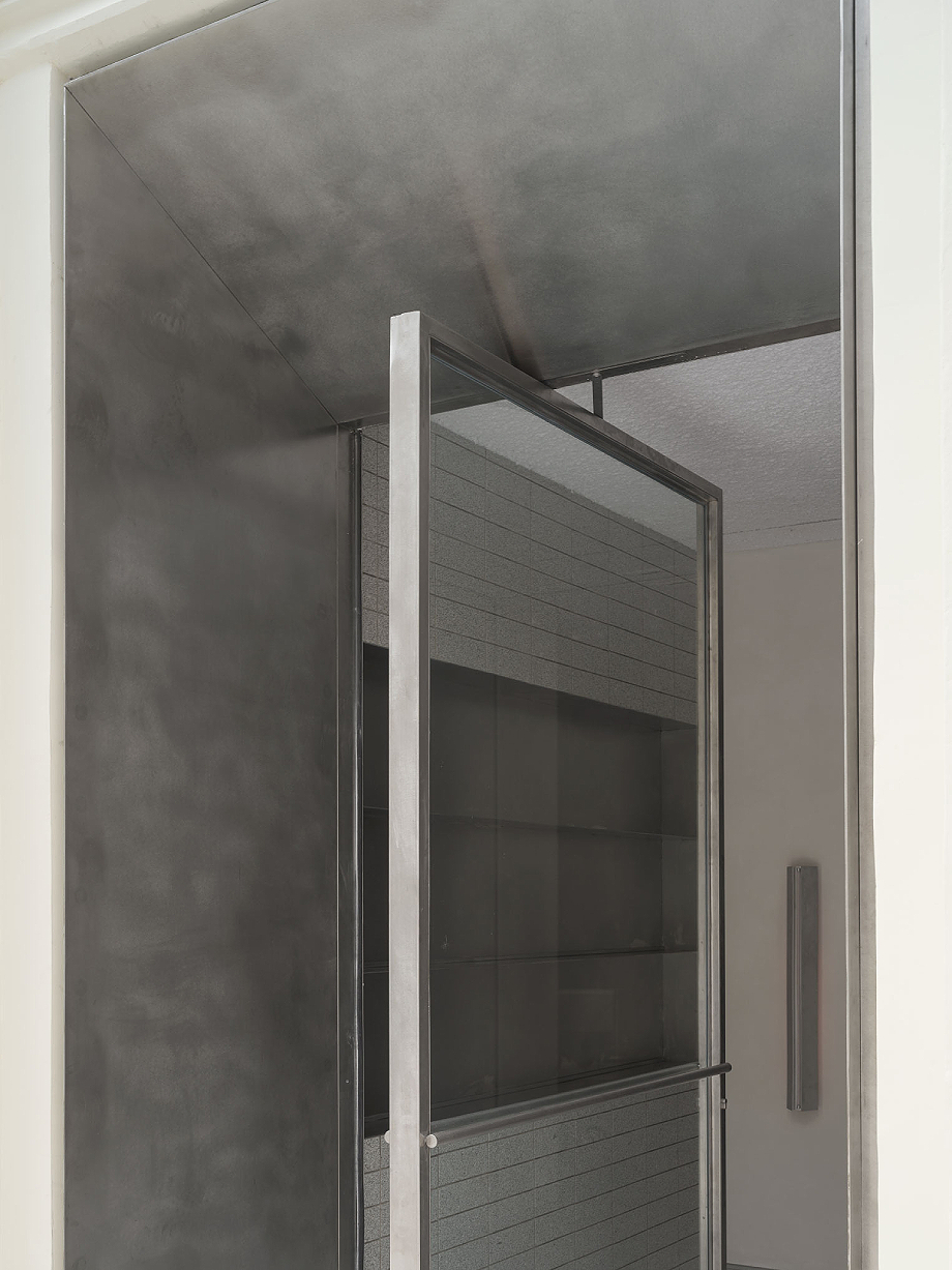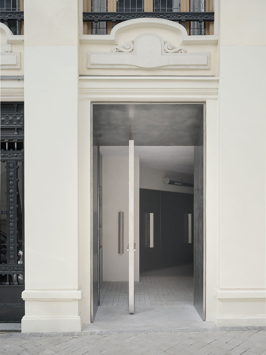Ubicado en la planta baja de un edificio existente, Palenqe se construye desde la improvisación y la innovación. El recorrido a través del local se convierte aquí en un elemento narrativo: el visitante atraviesa una monumental puerta de acero -única fuente de luz natural- que marca el umbral entre la calle y el interior. Tras ella, una sala revestida íntegramente en granito actúa como antesala, anticipando la atmósfera contenida, inmersiva y radical del conjunto.