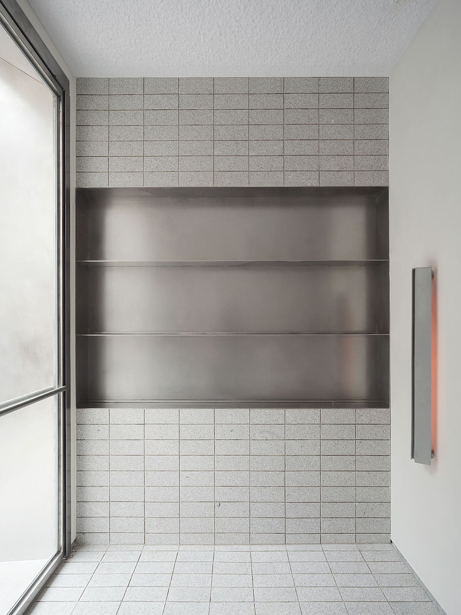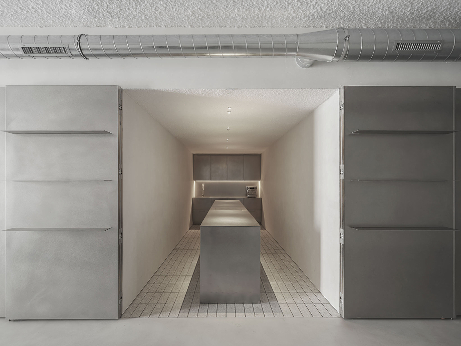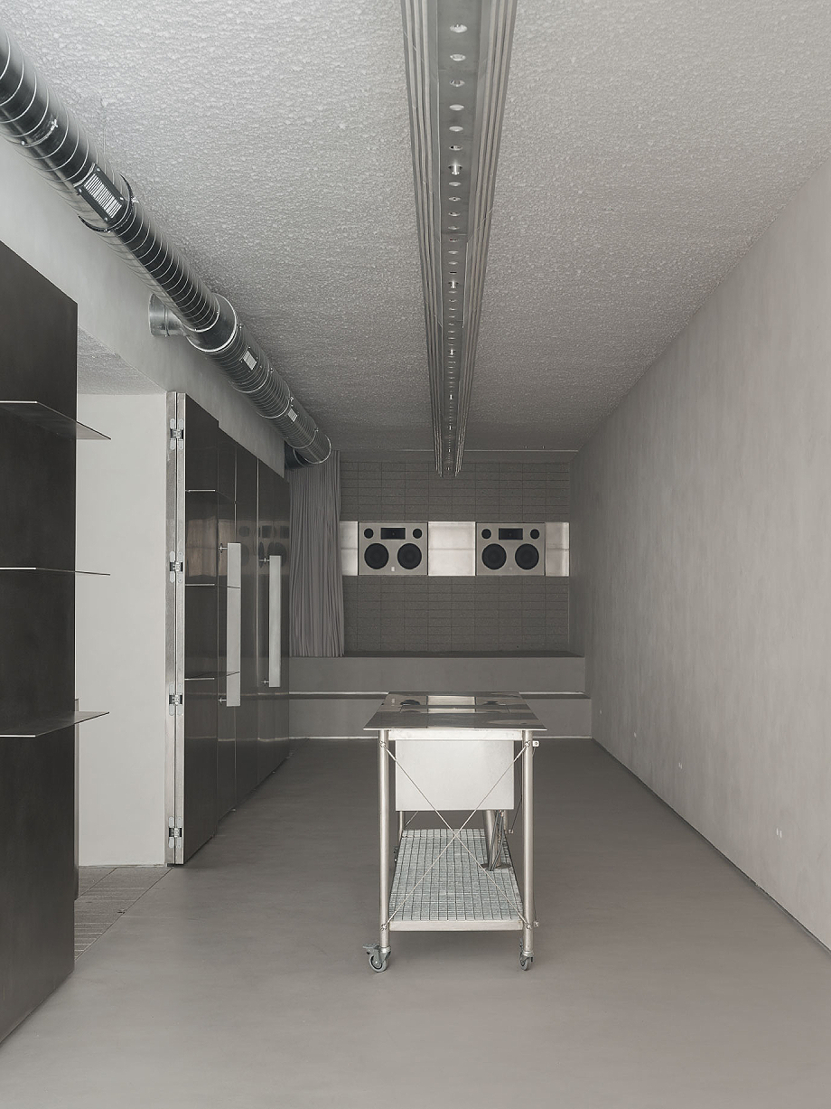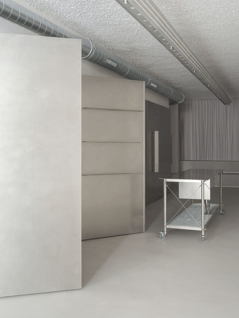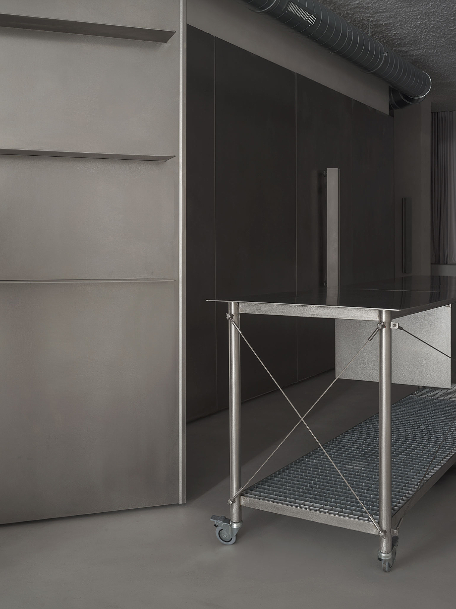 El espacio principal se estructura en torno a dos elementos dominantes: un sistema de luminarias que combina apliques murales con una pieza suspendida de gran formato que ilumina la nave de manera lineal, y un panelado de acero que cubre por completo una de las paredes. Este último oculta una de las primeras revelaciones del proyecto: dos paneles abatibles que descubren una cocina totalmente equipada, que se adapta al carácter cambiante y performativo del lugar.