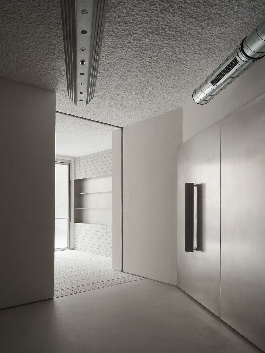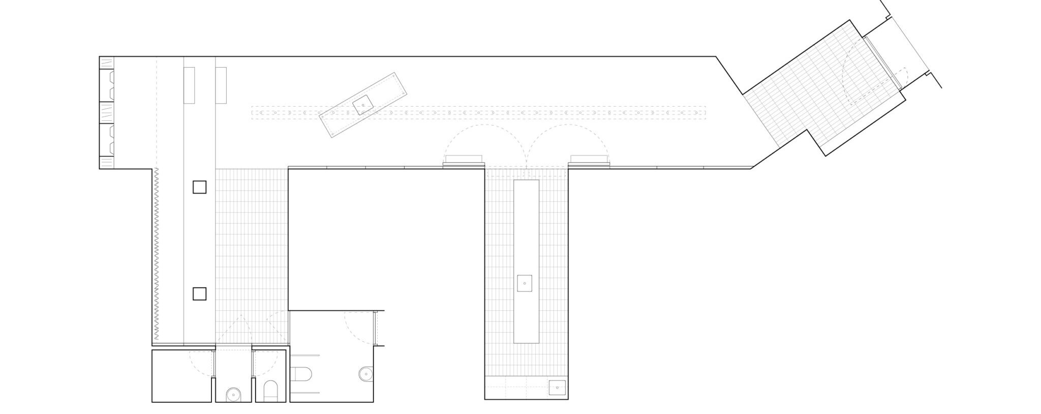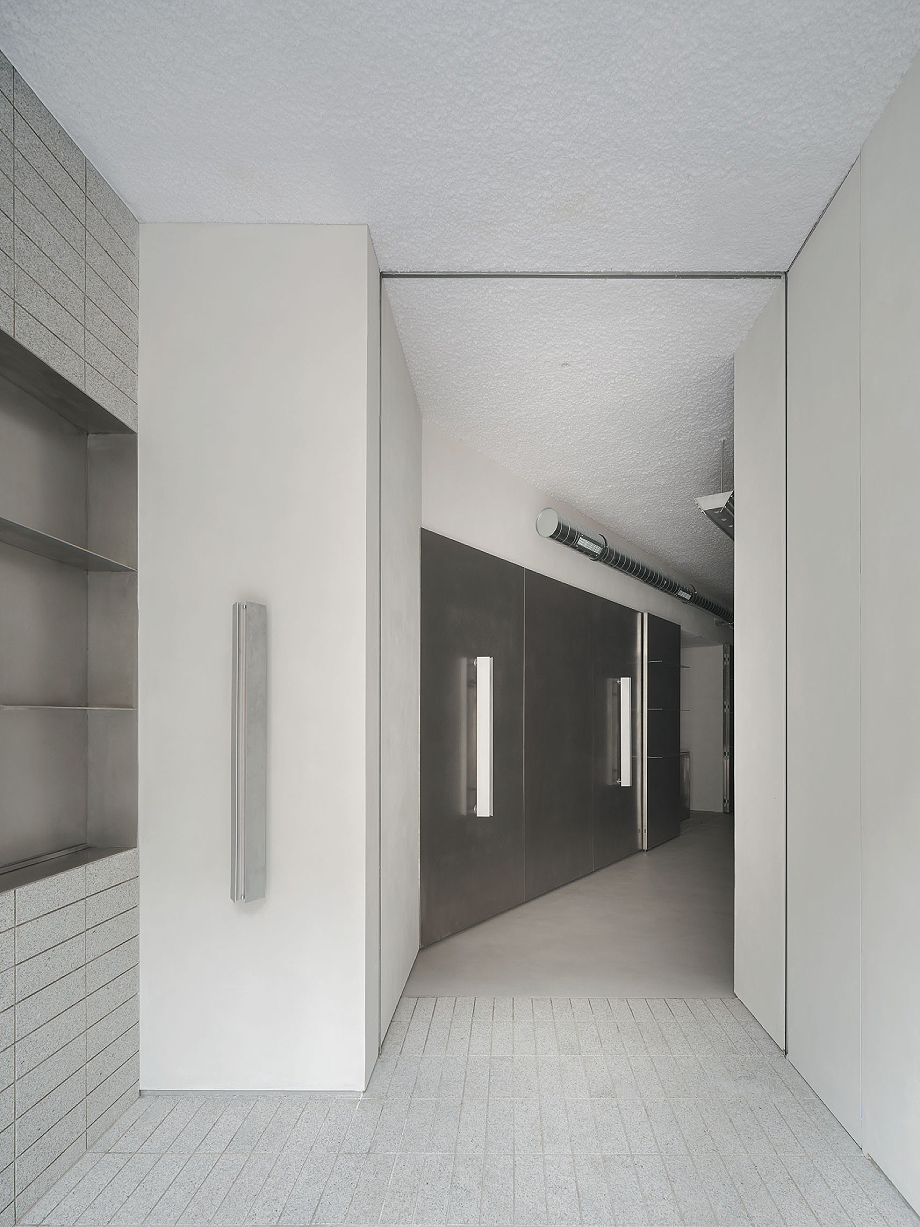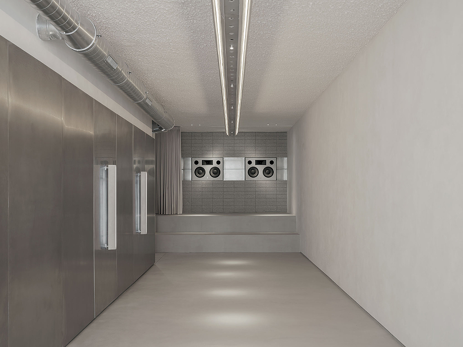 El espacio principal se estructura en torno a dos elementos dominantes: un sistema de luminarias que combina apliques murales con una pieza suspendida de gran formato que ilumina la nave de manera lineal, y un panelado de acero que cubre por completo una de las paredes. Este último oculta una de las primeras revelaciones del proyecto: dos paneles abatibles que descubren una cocina totalmente equipada, que se adapta al carácter cambiante y performativo del lugar.