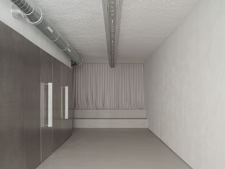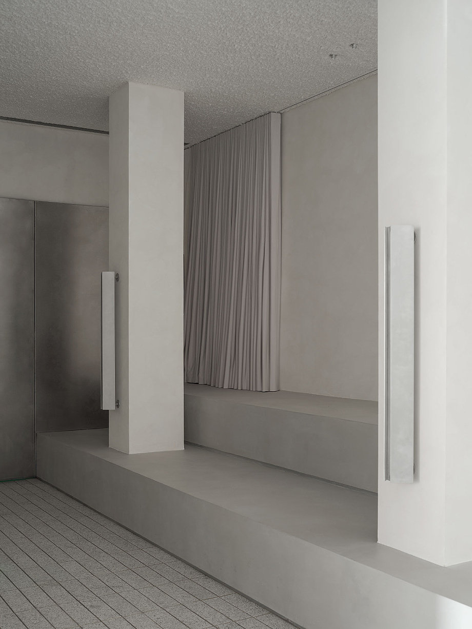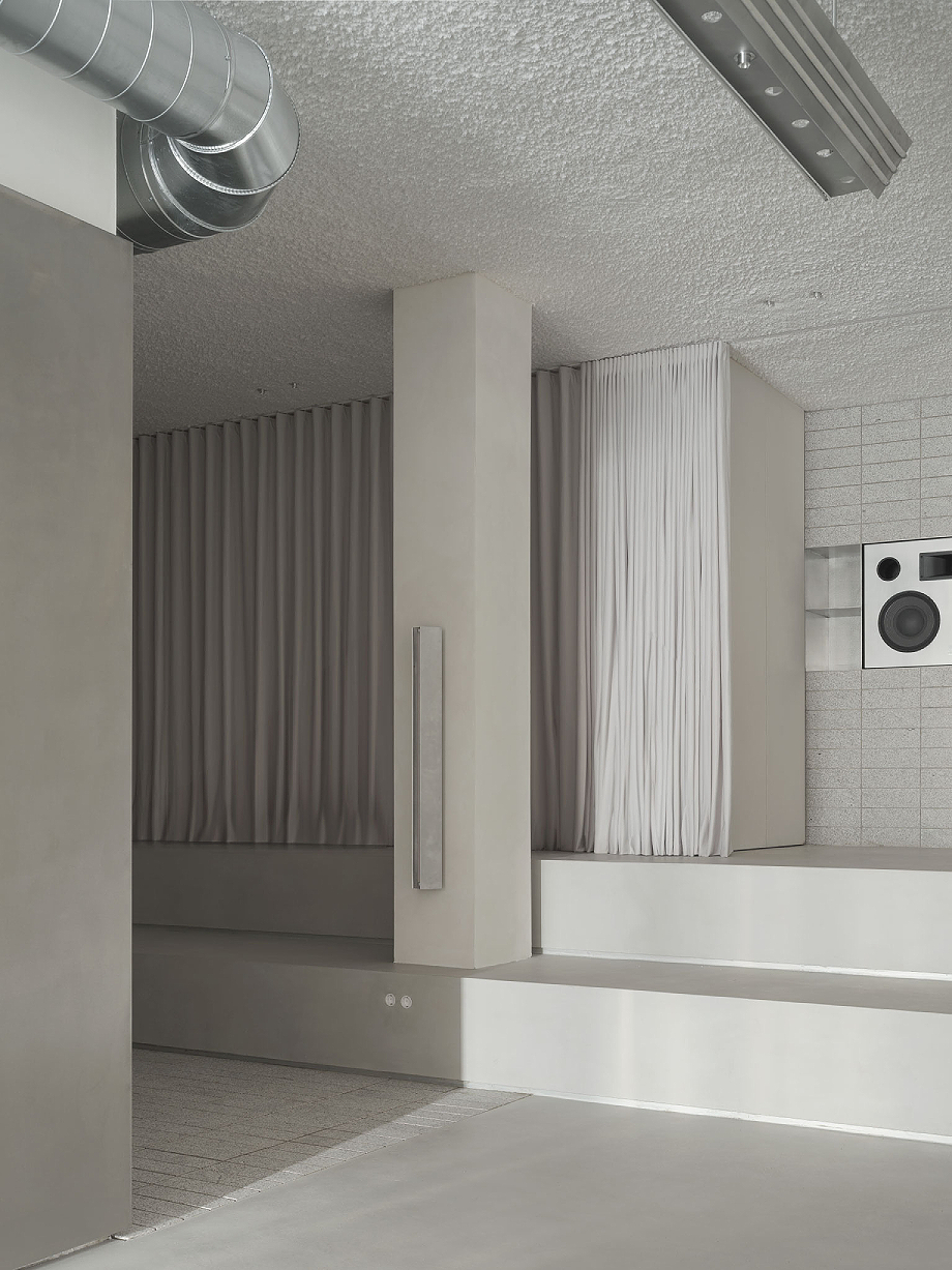 Al fondo, un graderío de generosas dimensiones asume una doble función -expositiva y social-, mientras que una cortina textil oculta un pequeño escenario revestido en granito y dotado de un sistema de sonido de última generación. Esta combinación de elementos dota al espacio de una identidad flexible, híbrida y contemporánea.