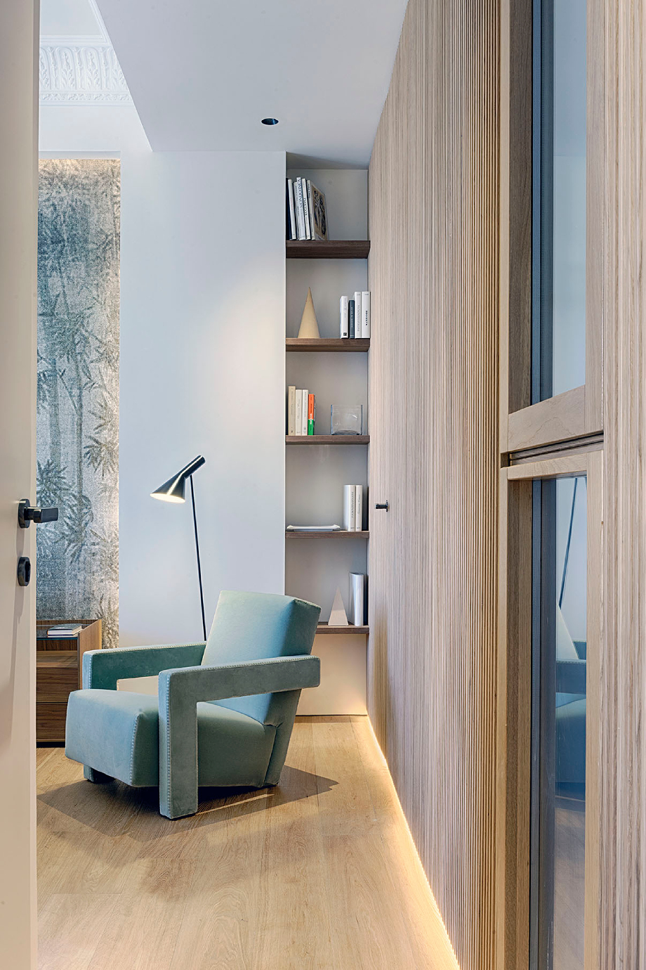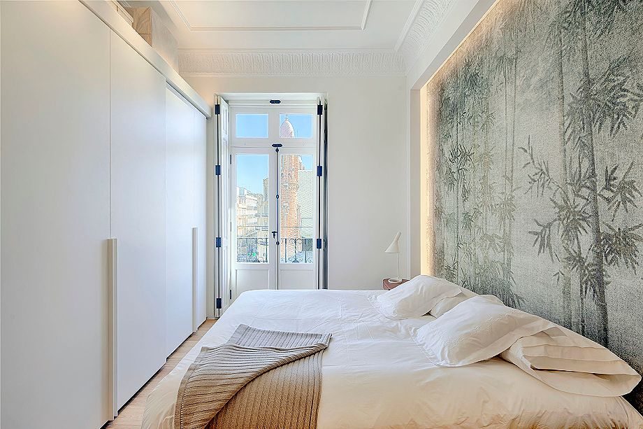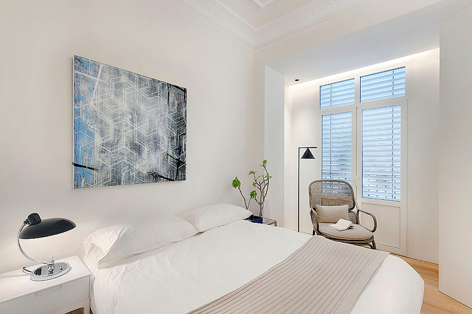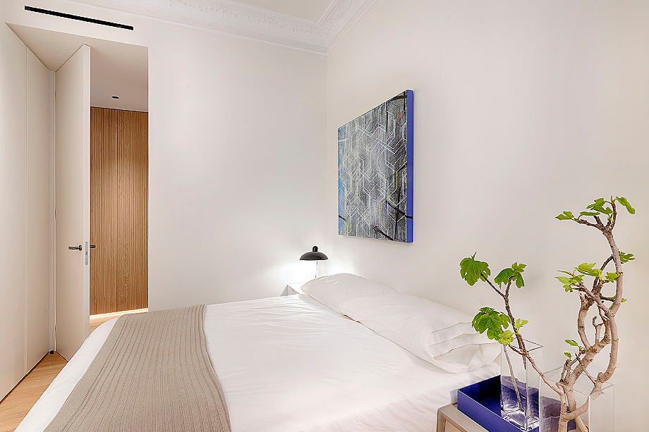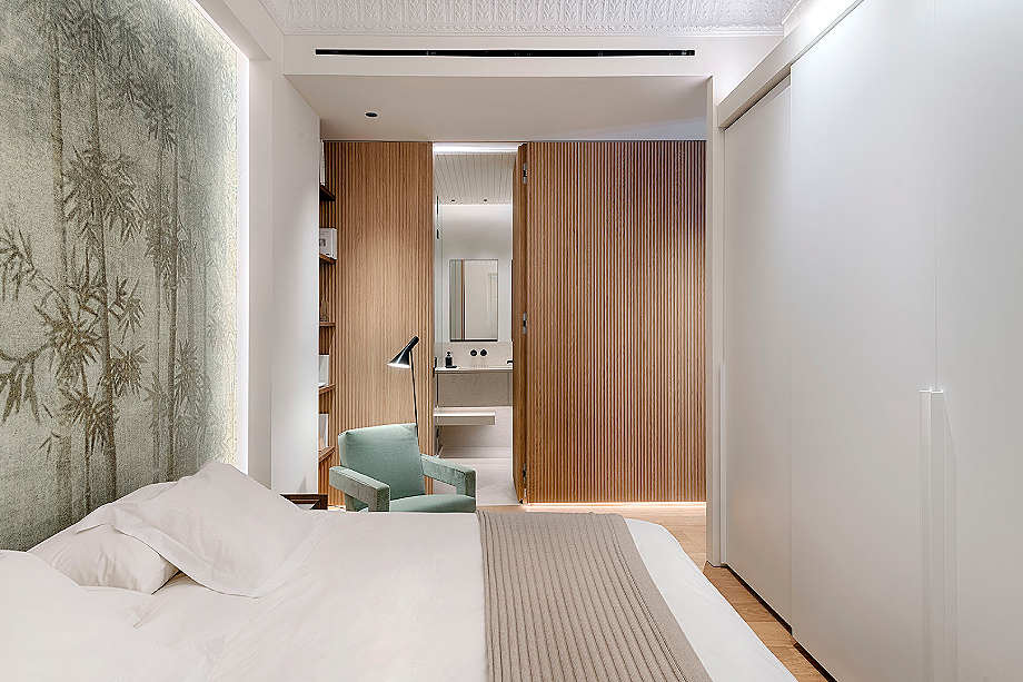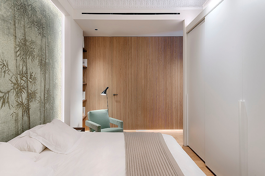 La zona de noche está claramente separada, contando con tres dormitorios, uno en suite con baño propio, y un segundo cuarto de baño. El dormitorio principal se ha concebido como un sereno refugio con un mural que actúa como cabecero, mientras que piezas icónicas como la butaca Utrecht de Cassina y luminarias de Louis Poulsen refuerzan el carácter elegante de la estancia. El armario, diseñado por el estudio, es el modelo Storage de Porro y completa la zona de descanso. La combinación de maderas, tejidos e iluminación indirecta crea una atmósfera íntima y sofisticada. Además, el panelado de roble organiza el espacio, ocultando el acceso al baño y aportando orden visual.
