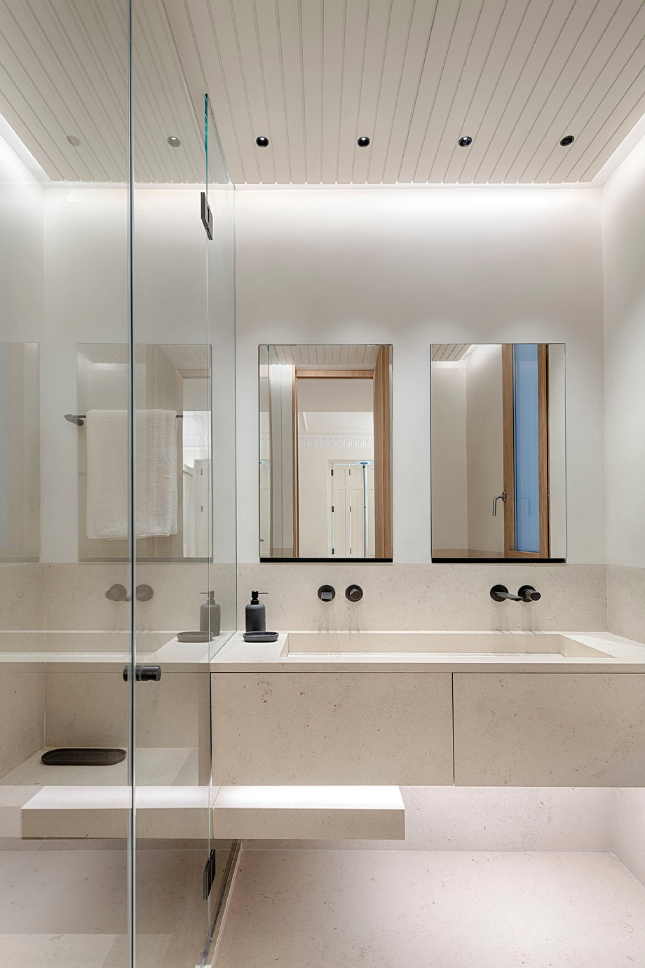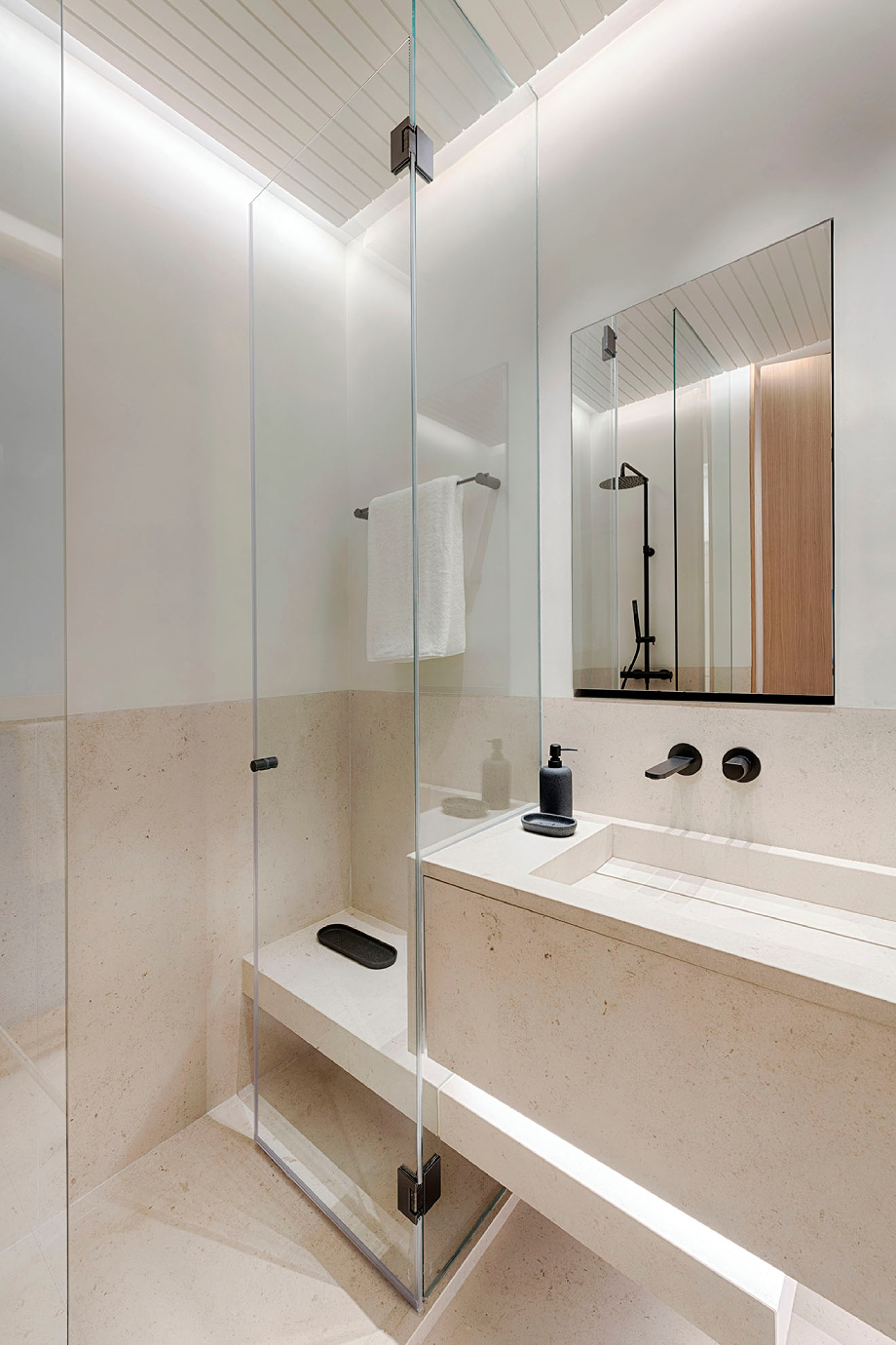 El hilo conductor del diseño reside en el equilibrio de materiales, donde la calidez táctil de maderas nobles como el roble y el nogal establece un contraste elegante con la sobriedad mineral de la piedra caliza y el microcemento blanco. Este esquema cromático y textural, junto con el uso de pinturas ecológicas y lacas de acabado mate, crean una atmósfera cálida y equilibrada.