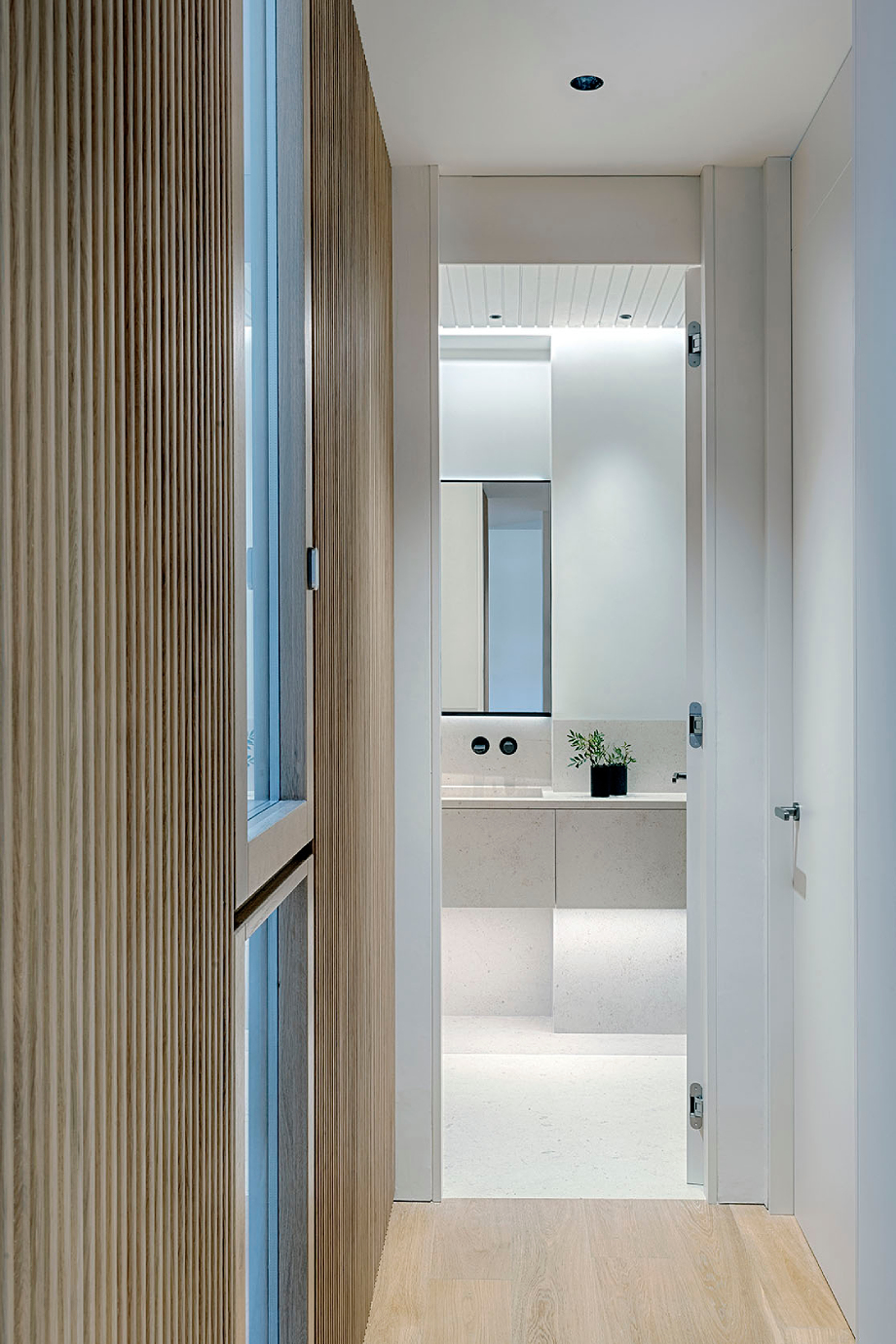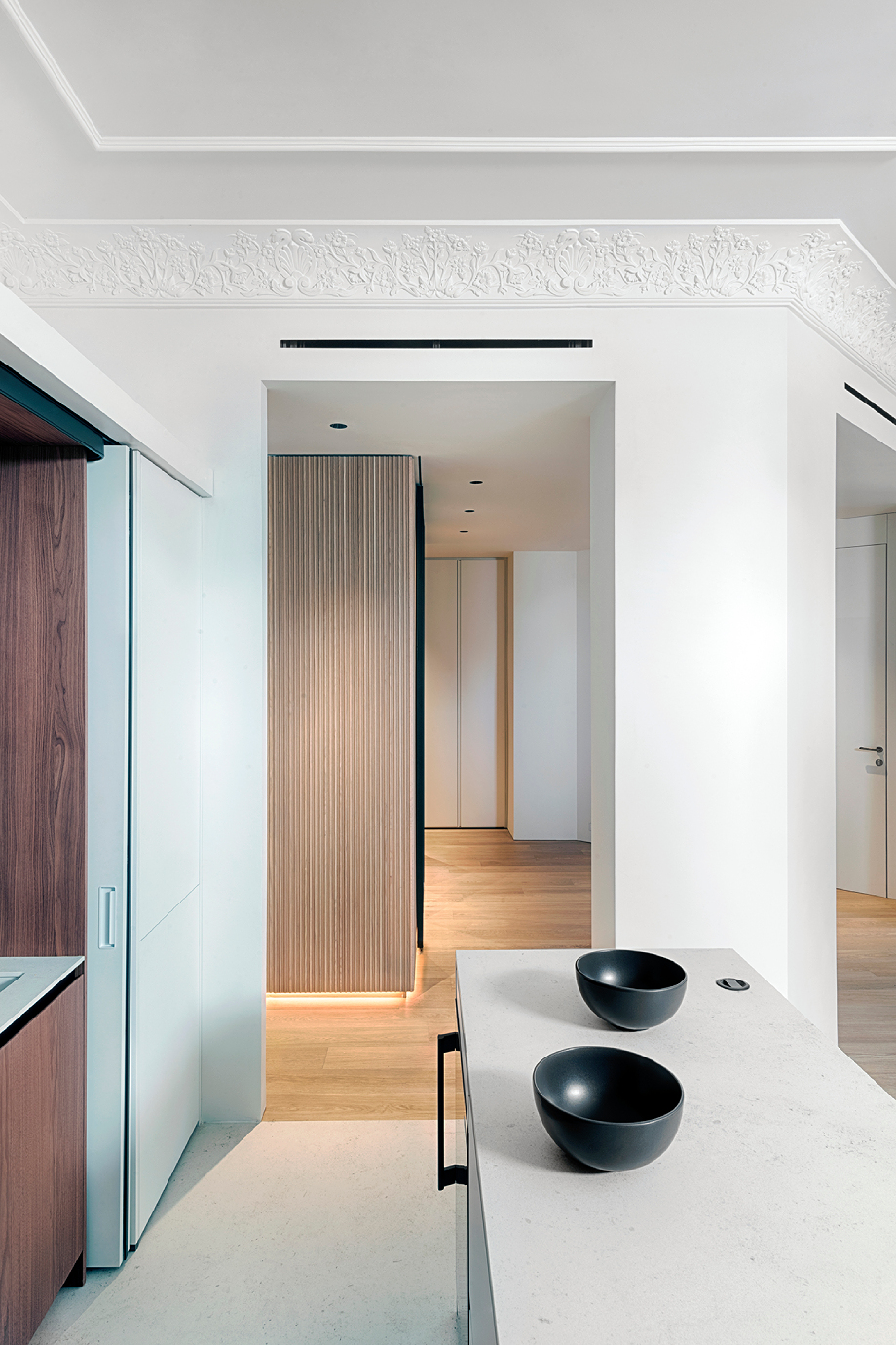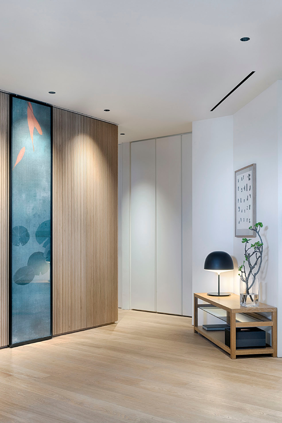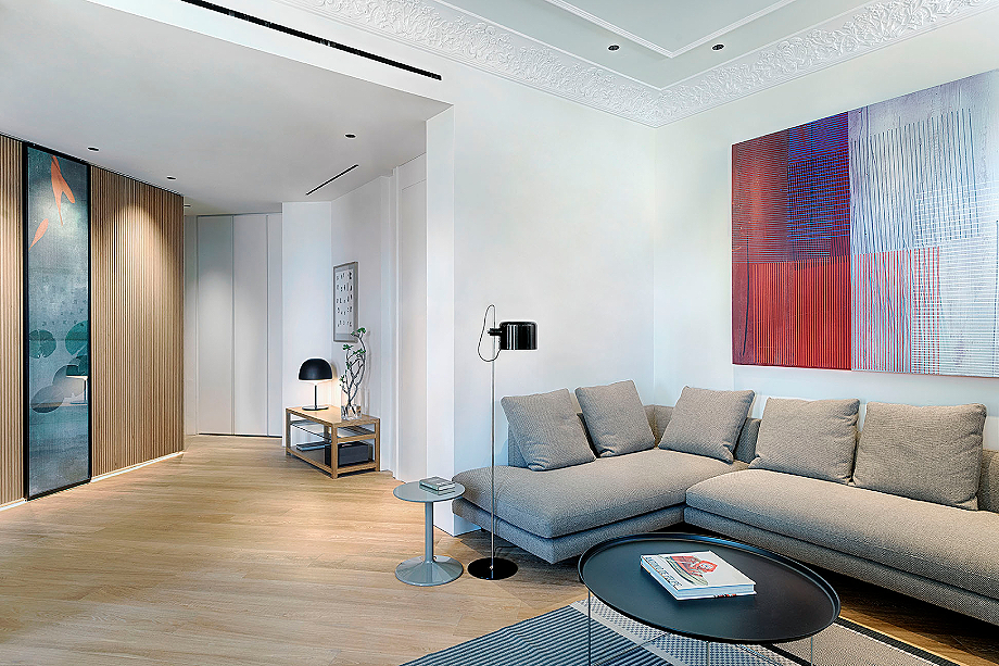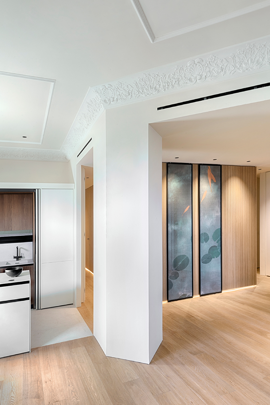 La vivienda, que cuenta con 120 m² y planta irregular, fue diseñada para aprovechar al máximo tanto el espacio como la luz natural. Al entrar, un distribuidor organiza y conecta las distintas zonas, mientras un panelado alistonado de roble recorre toda la vivienda, actuando como columna vertebral y generando una sensación de continuidad cálida y armoniosa. La entrada se realza mediante un díptico móvil con motivos naturales de estética japonesa, que aporta un delicado gesto artístico contemporáneo.