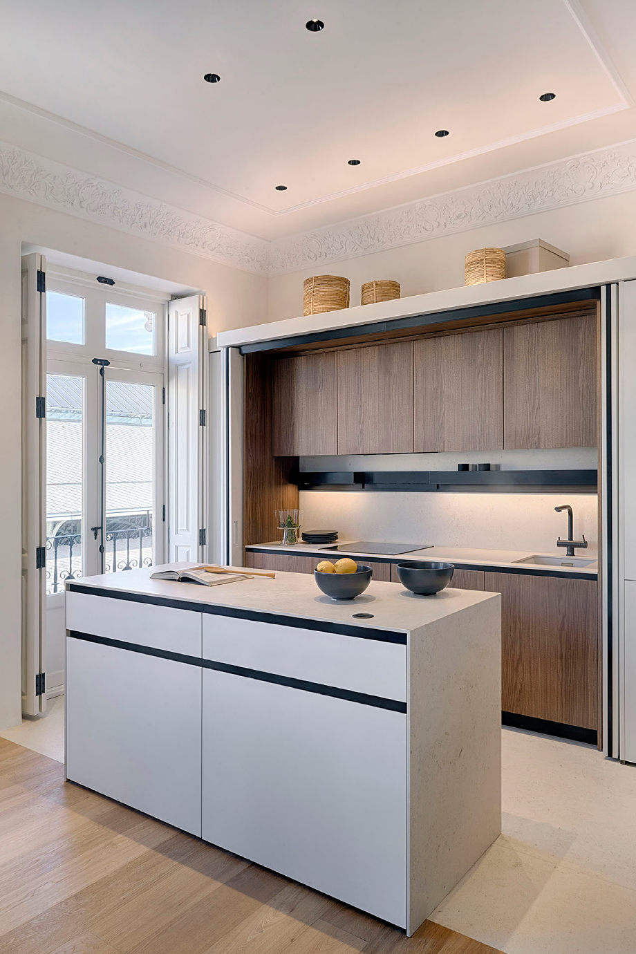 La cocina, diseño del arquitecto Antonio Citterio para Arclinea, se integra en el espacio común, pero puede ocultarse completamente dentro de un volumen arquitectónico que se cierra mediante puertas escamoteables New Pocket. Estas puertas se deslizan lateralmente y se esconden en los laterales del módulo, evitando interferir en el paso, dejando expuesta toda la superficie de trabajo cuando es necesario. Esta solución permite mantener la fluidez y la estética limpia del espacio principal cuando la cocina no está en uso, mientras asegura un espacio de cocina completamente funcional y de alto rendimiento.