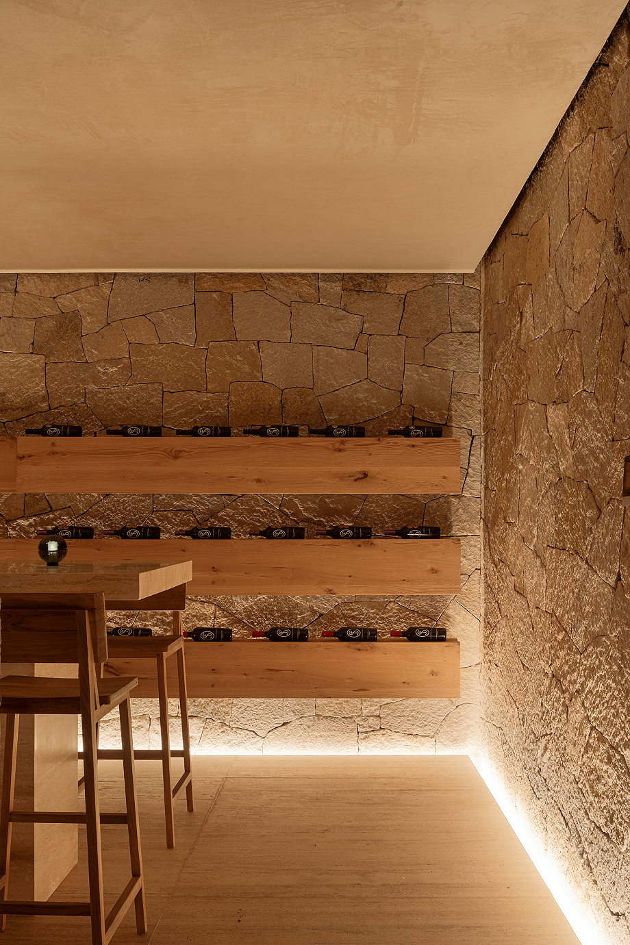 En el interior, el mobiliario de roble, elegido por su simplicidad, y una iluminación cálida que rememora la luz de los conventos del siglo XVI completan la atmósfera. La luz natural penetra de manera controlada, proyectando sombras que cambian con las estaciones y subrayando la idea de que el tiempo es un material más en el proceso arquitectónico.
