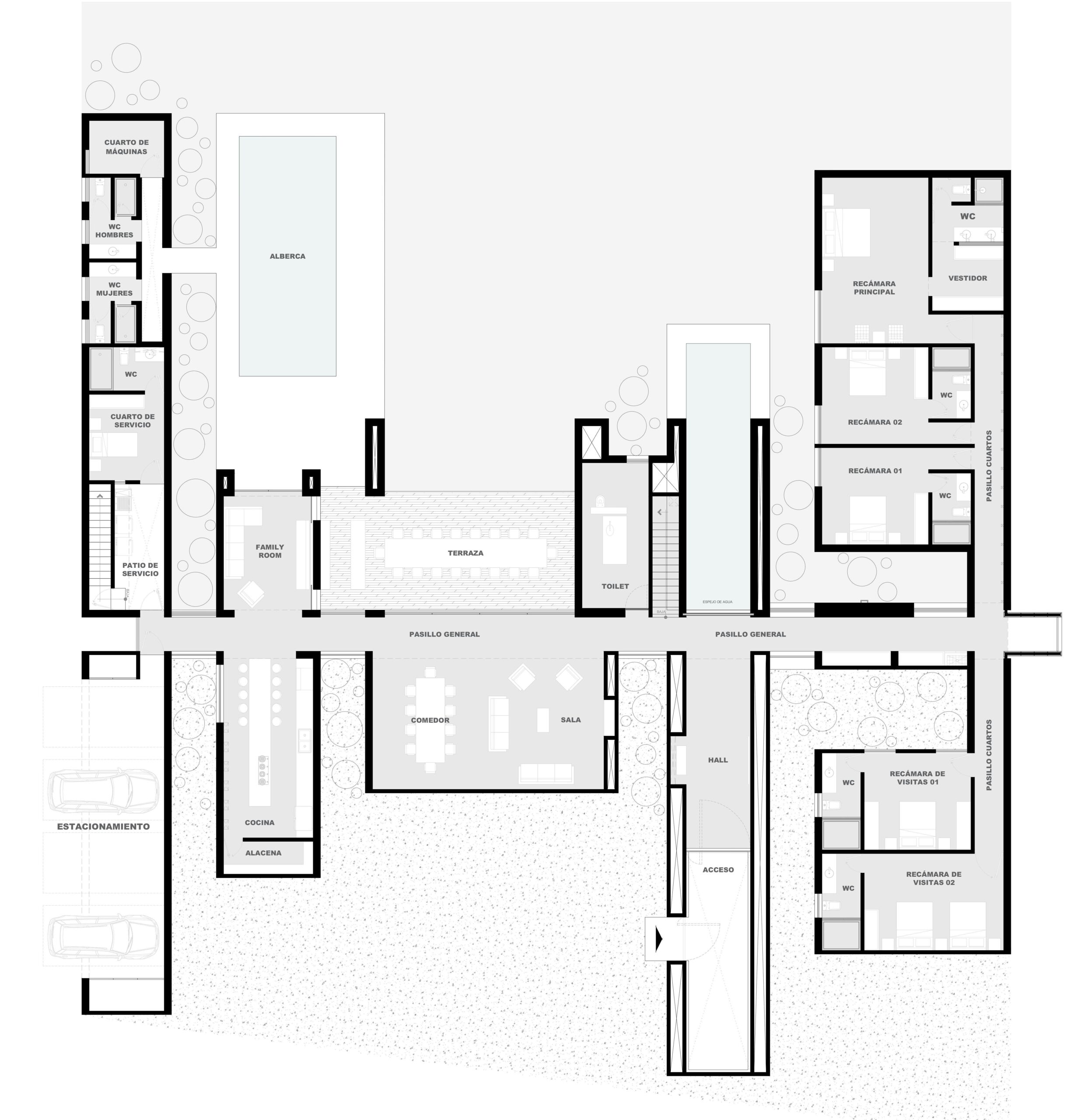 Se accede a él a través de una entrada con un techo de doble altura que funciona como umbral entre dos mundos: la vastedad del viñedo (el exterior) y la serenidad doméstica (el interior). En el ala oeste, se disponen las áreas públicas (comedor, terraza, cocina, sala, garaje y zonas de servicio), mientras que las cuatro recámaras privadas se orientan al este.