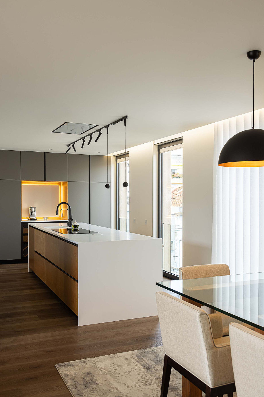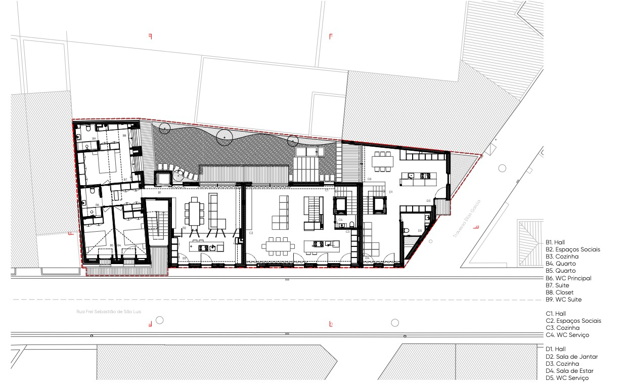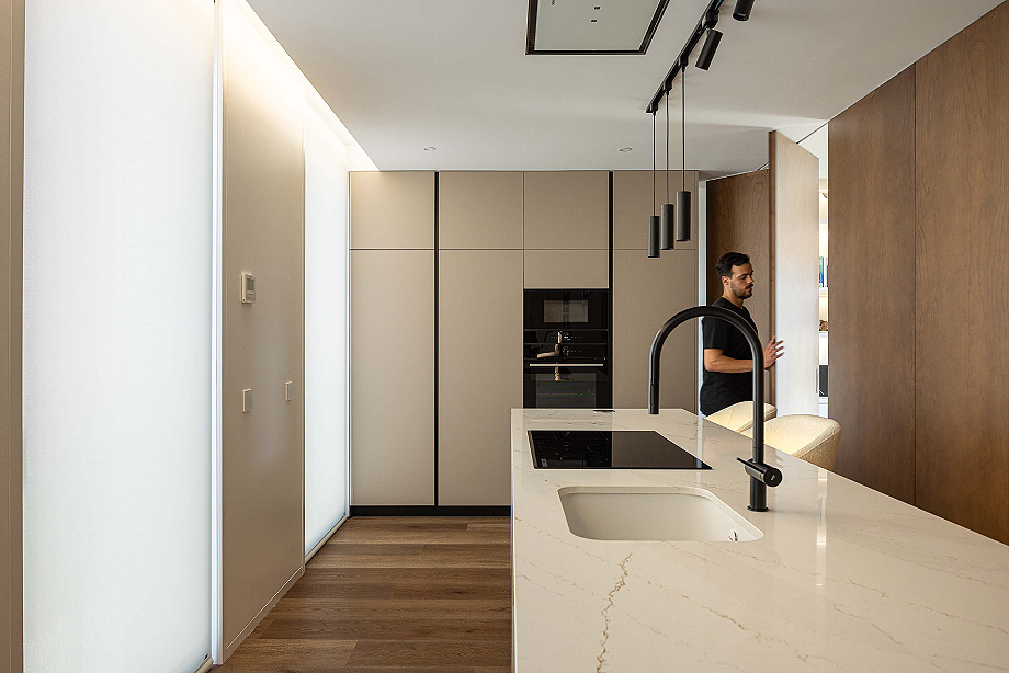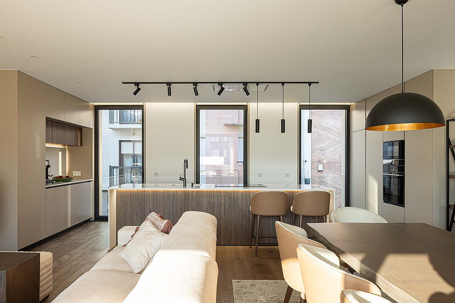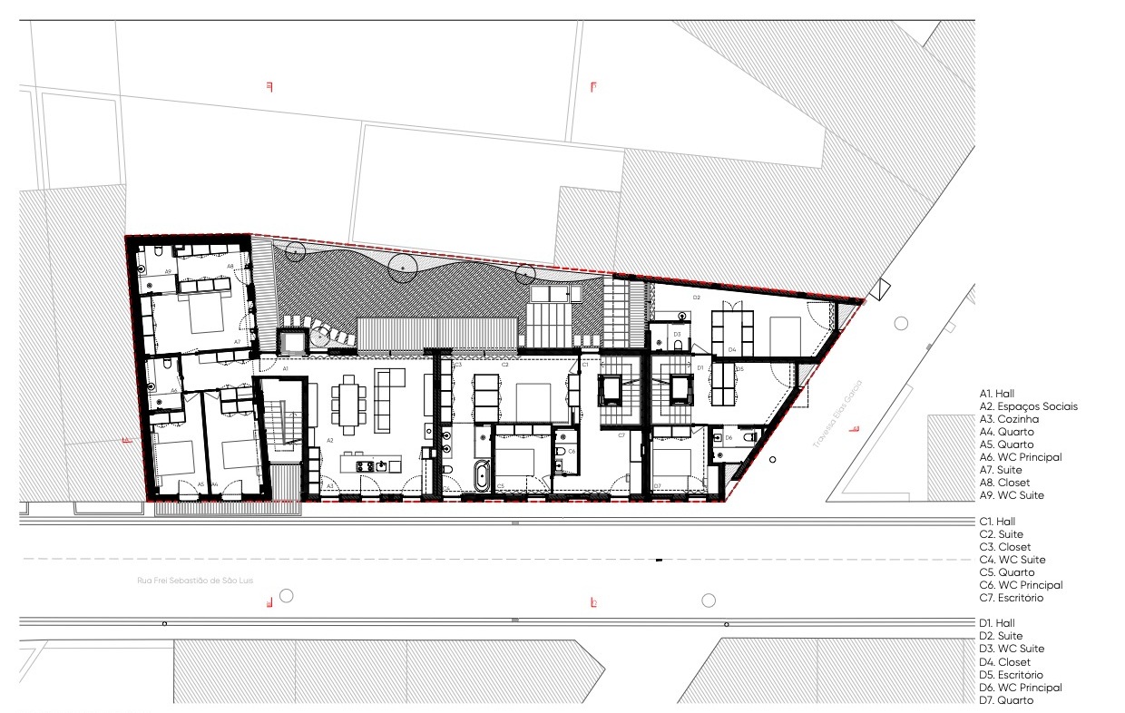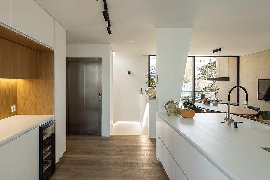 La fachada trasera, orientada hacia el patio interior, se abre generosamente al exterior. Grandes ventanas y balcones conectan las áreas sociales con el exterior, garantizando luz solar, ventilación cruzada y un estilo de vida más orientado al sol. En los apartamentos de la estructura rehabilitada, los espacios íntimos -dormitorios y suite- permanecen en el volumen original, mientras que las áreas sociales se despliegan hacia la nueva ampliación, optimizando la exposición solar. La cocina, visualmente integrada con la sala de estar, se convierte en un espacio doméstico central y compartido.