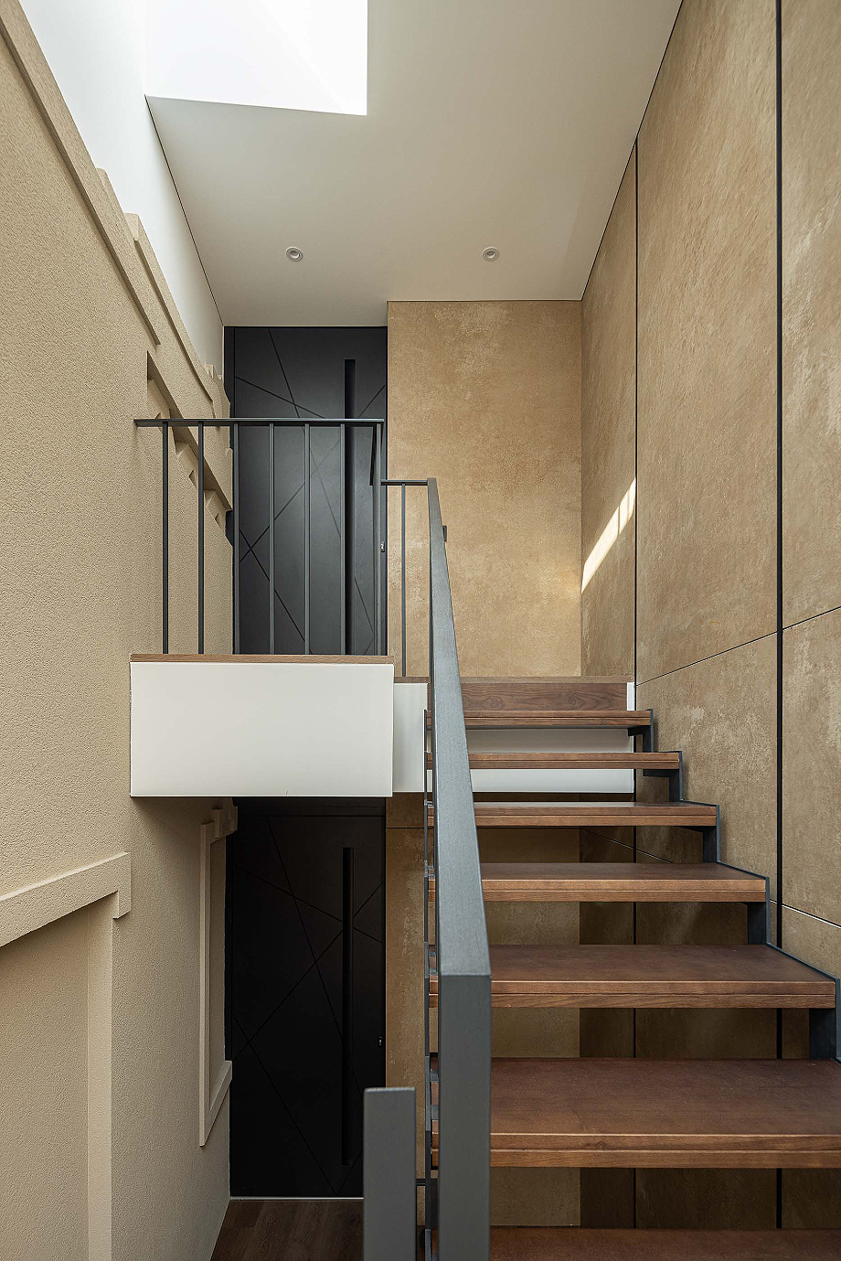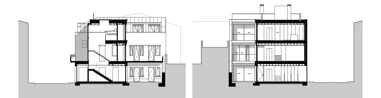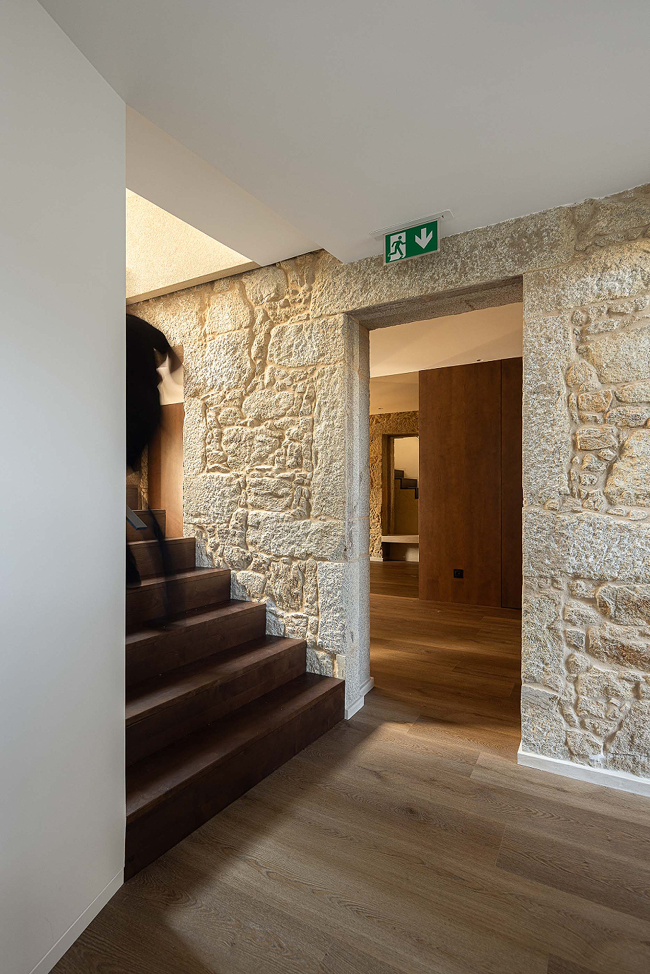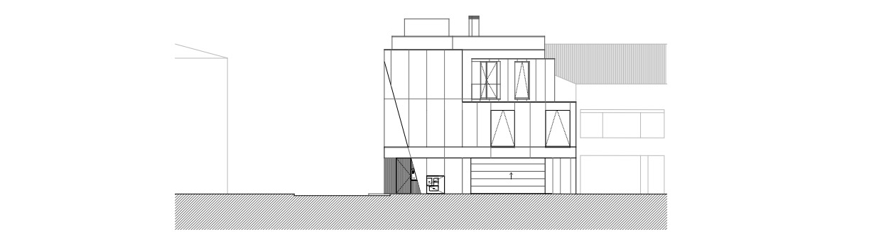 La fachada principal respeta el ritmo original de las ventanas, equilibrando luz natural y privacidad, reinterpretándolo con una nueva voz que dialoga con la vida urbana contemporánea. La escalera acristalada actúa como nexo entre lo antiguo y lo nuevo, entrelazando materiales distintos y marcando la transición temporal de la intervención. En la fachada lateral, se rompe deliberadamente el ritmo de las ventanas mediante un corte diagonal, aportando luz adicional al interior y dotando al alzado de una identidad arquitectónica singular.