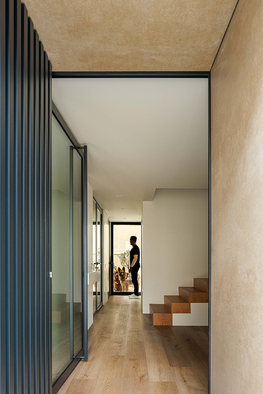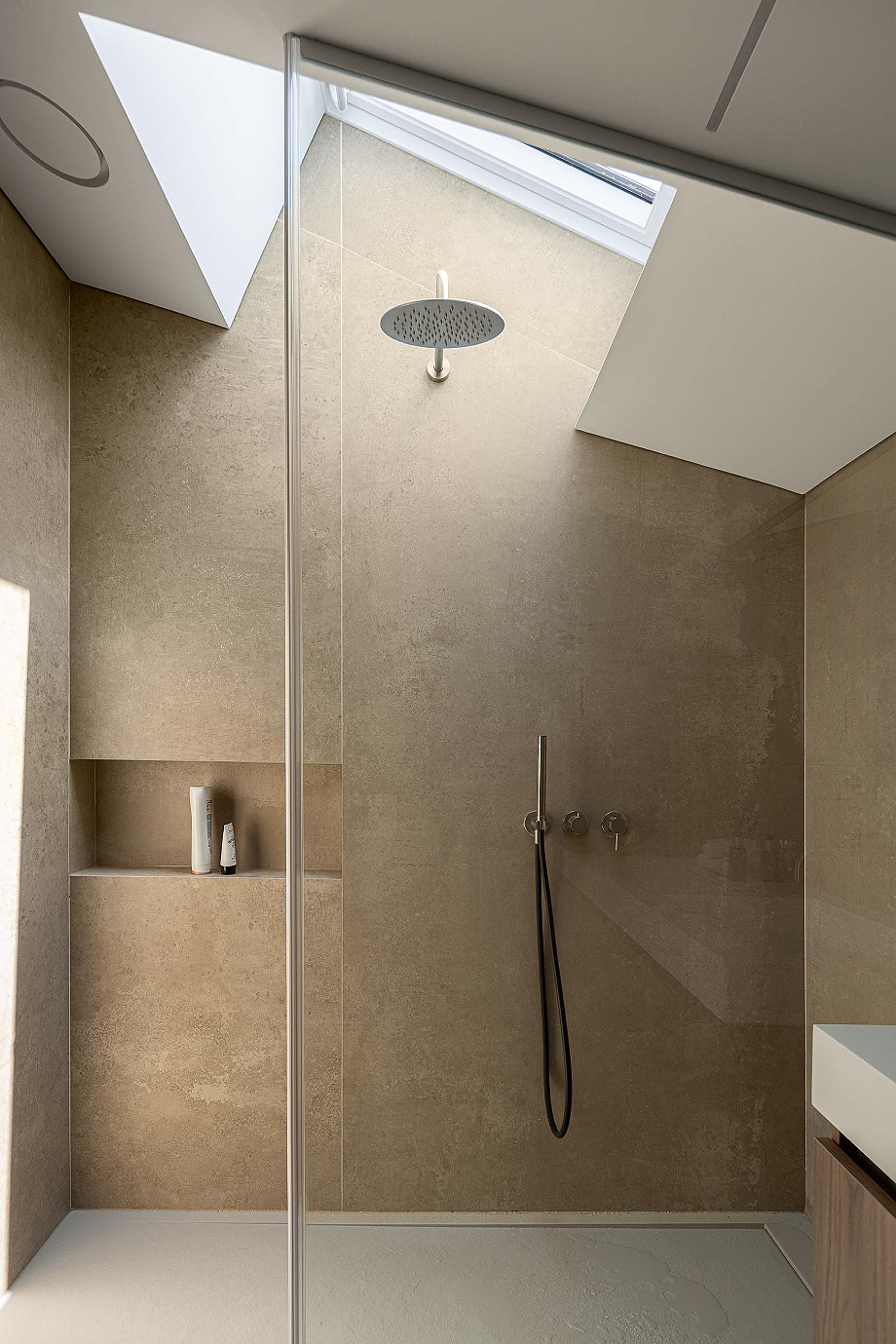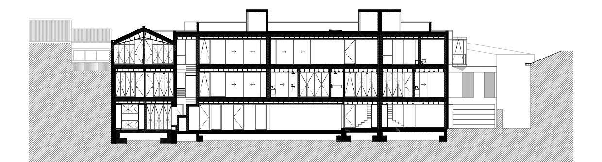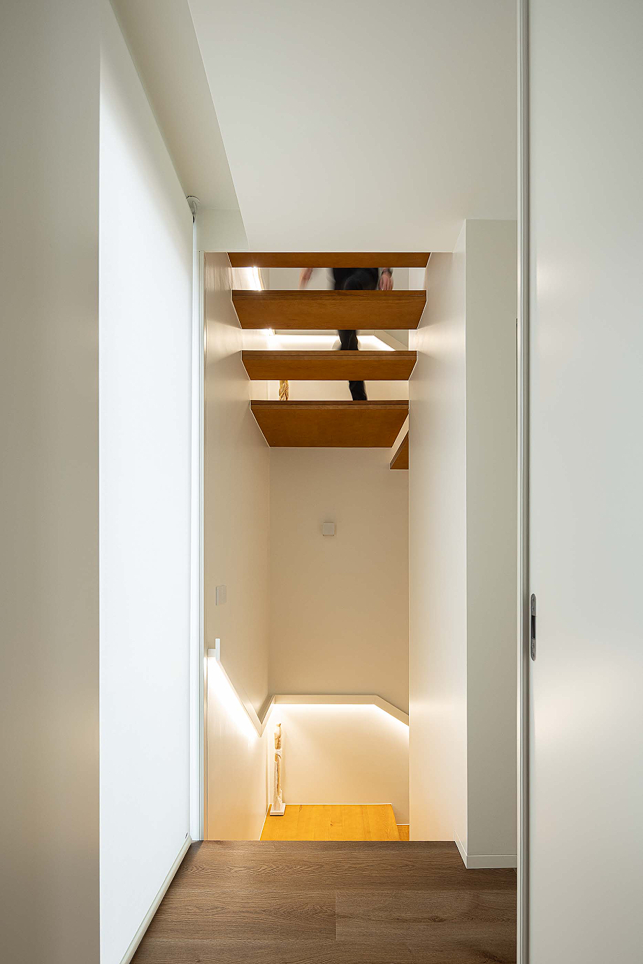 La fachada principal respeta el ritmo original de las ventanas, equilibrando luz natural y privacidad, reinterpretándolo con una nueva voz que dialoga con la vida urbana contemporánea. La escalera acristalada actúa como nexo entre lo antiguo y lo nuevo, entrelazando materiales distintos y marcando la transición temporal de la intervención. En la fachada lateral, se rompe deliberadamente el ritmo de las ventanas mediante un corte diagonal, aportando luz adicional al interior y dotando al alzado de una identidad arquitectónica singular.