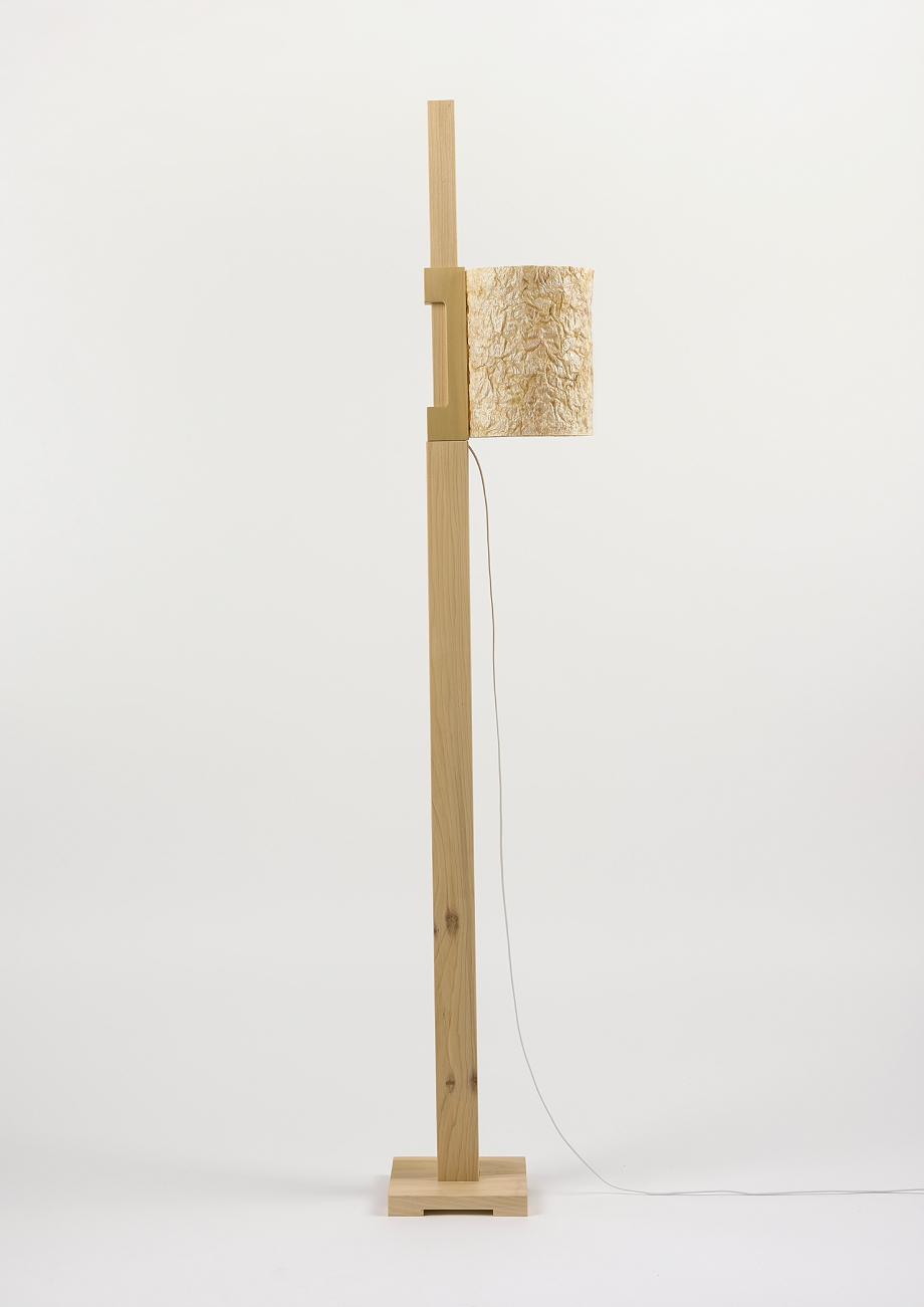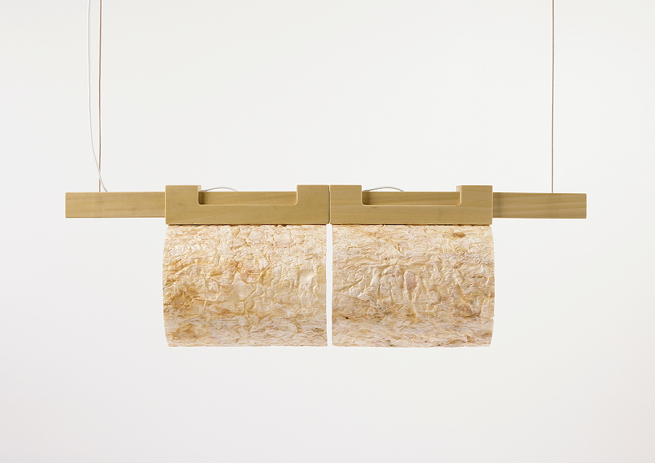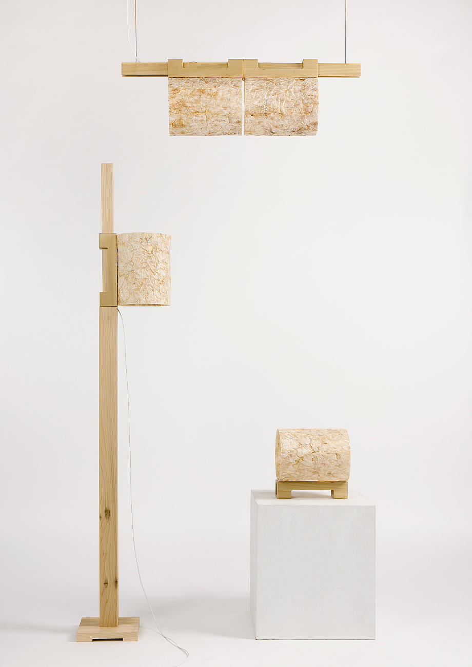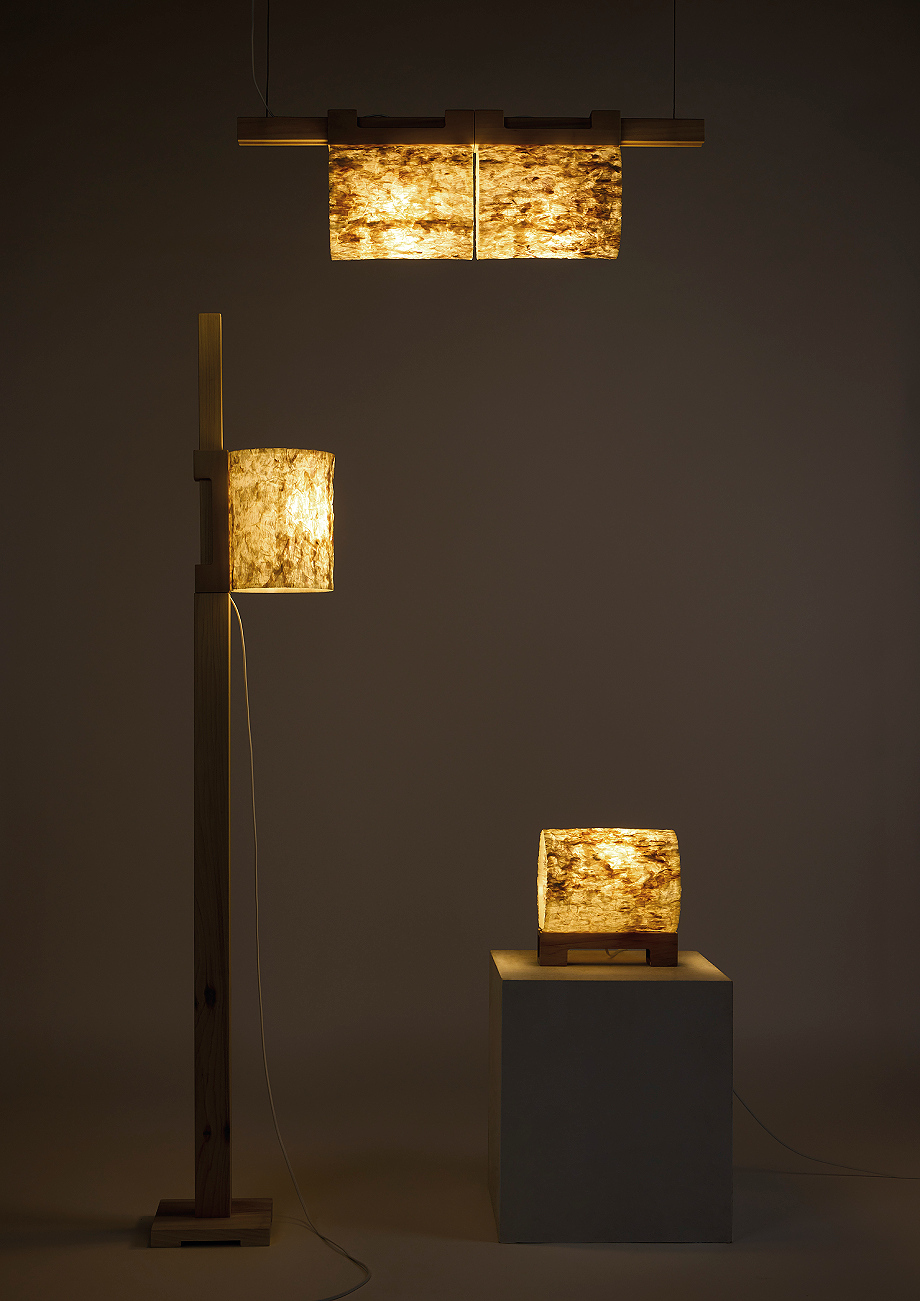 Allium se inspira en la naturaleza, evocando la estructura de un árbol. Las luminarias combinan un soporte de madera de álamo, elegida por sus vetas verdes aleatorias, con una pantalla elaborada a partir de pieles de ajo tratadas que reproducen las hojas. «La idea surgió cocinando. Tenía un montón de peladuras de ajos y, al recogerlas, pensé que algo se podía hacer con ellas en lugar de tirarlas, ya que tenían una textura bonita y parecían papel”, explica Ester Cruz.