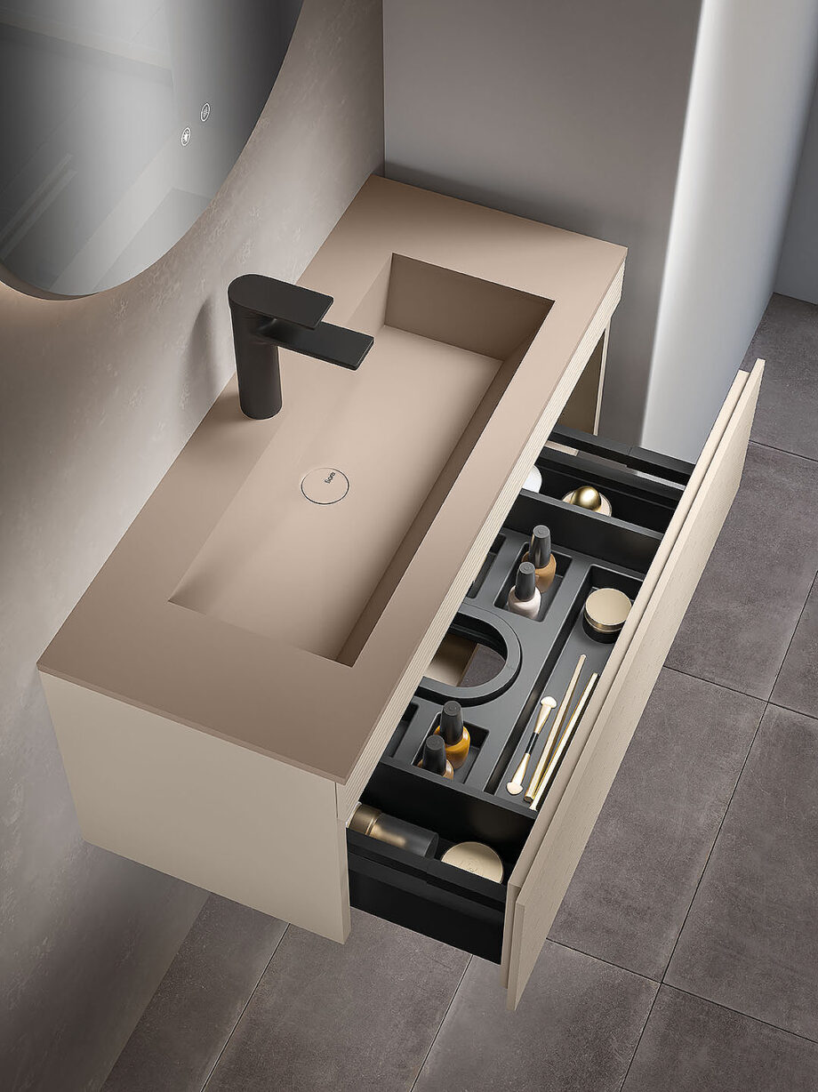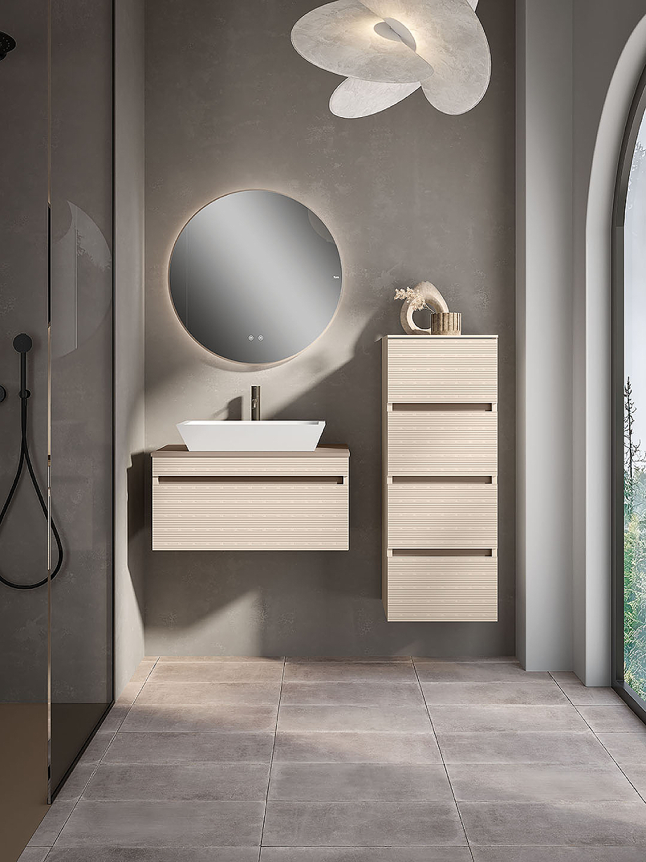 La nueva propuesta ofrece tres distintas configuraciones: mueble de un cajón, mueble de dos cajones y consola con lavabo, adaptándose a diferentes necesidades de uso y almacenamiento. Además, se incorpora una columna de cajones a juego, que permite ampliar el espacio de almacenaje conservando la armonía visual del conjunto.