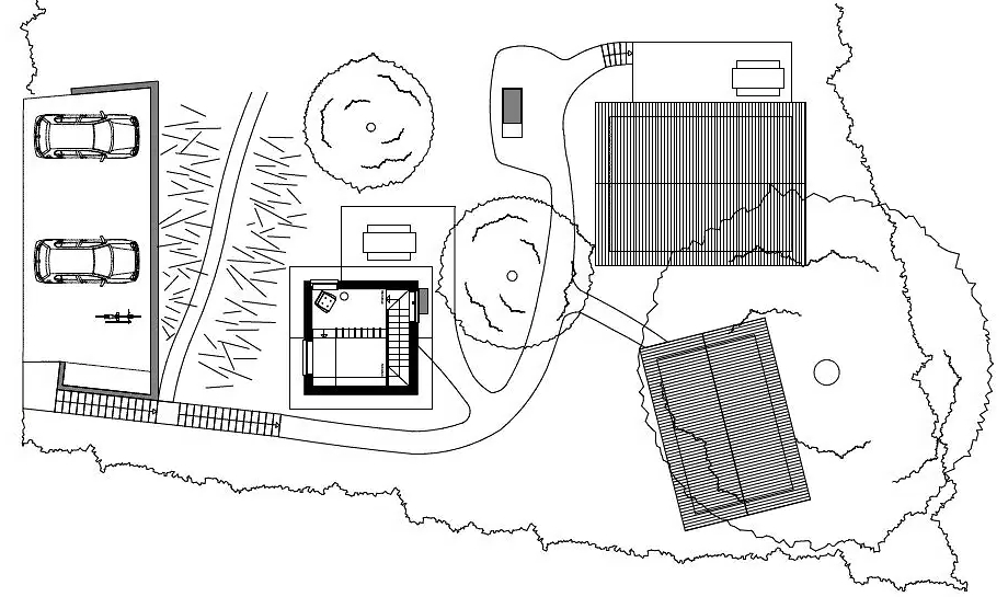 En el interior, los suelos de madera maciza conviven con superficies de hormigón pulido y baldosas resistentes al agua. Los caminos, terrazas y zonas de aparcamiento cuentan con un sistema de drenaje que permite la filtración natural del agua.
