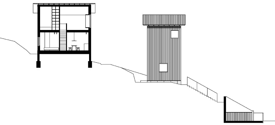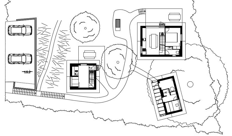 El acceso al conjunto se realiza desde abajo, a través de una larga escalera de hormigón que conduce a los volúmenes escalonados de las viviendas, adaptados al terreno inclinado. La Haus Gipfelglück, de tres plantas y capacidad para dos personas, se ubica en la parte baja de la parcela, mientras que la Haus Waldwunder, con dos niveles y mayor tamaño, ofrece espacio para cuatro huéspedes y se eleva un poco más arriba.