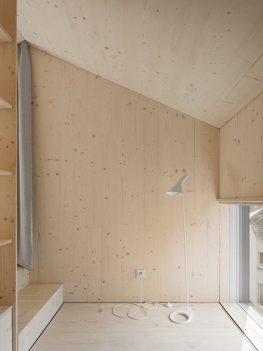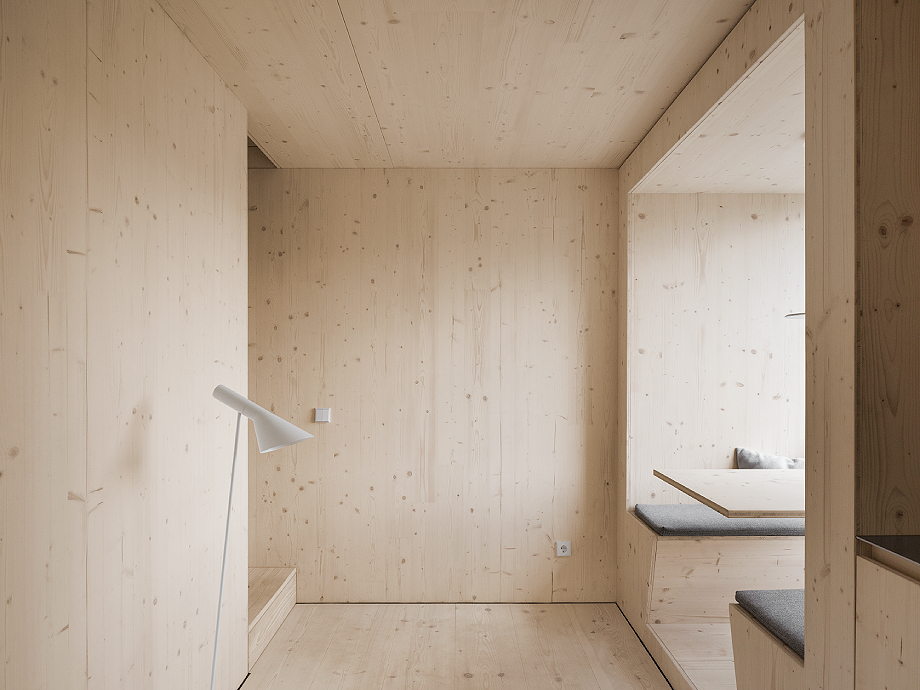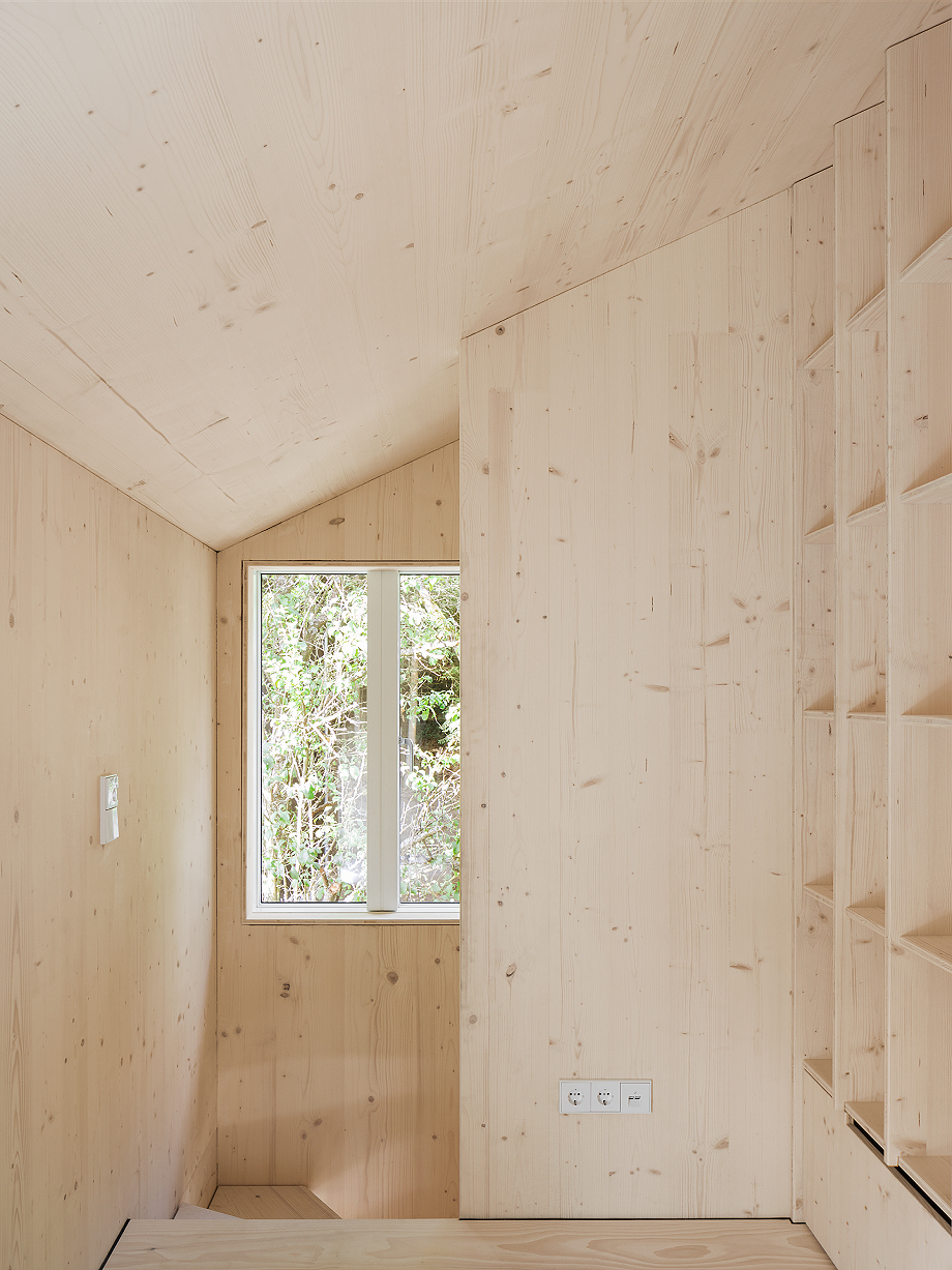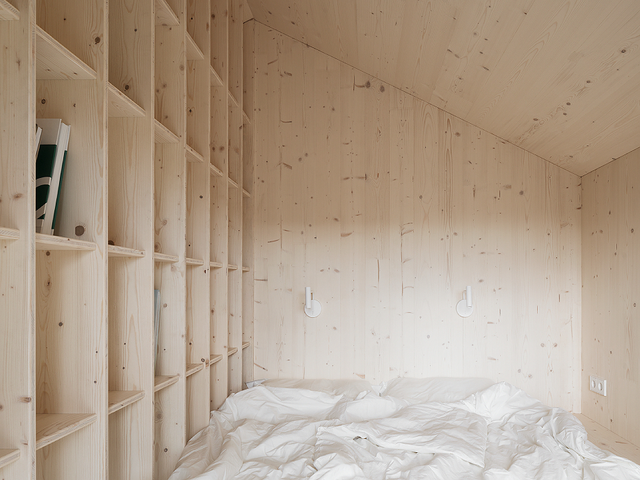 El interior, revestido íntegramente con superficies de madera clara, evoca la atmósfera cálida de una cabaña de montaña o una casa en el árbol. Suelos, paredes, techos, mobiliario y carpinterías parecen tallados en una sola pieza, creando una continuidad táctil y visual que refuerza la sensación de refugio. La pureza del diseño, sin artificios, invita al descanso y la contemplación.