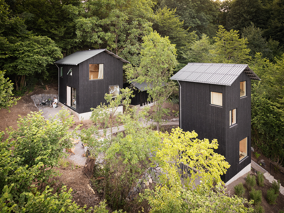 El proyecto demuestra un profundo respeto por el medio ambiente. Kleine Bleibe se adapta cuidadosamente al terreno y a la vegetación existente, conservando los árboles centenarios que rodean las casas y sin perjudicar a los nogales y los ciruelos. Los elementos estructurales en contacto con el suelo se han ejecutado en hormigón, garantizando durabilidad, mientras que el resto de la construcción -fachadas, aislamiento, paredes, techos, cubierta y mobiliario- se ha realizado íntegramente en madera.
