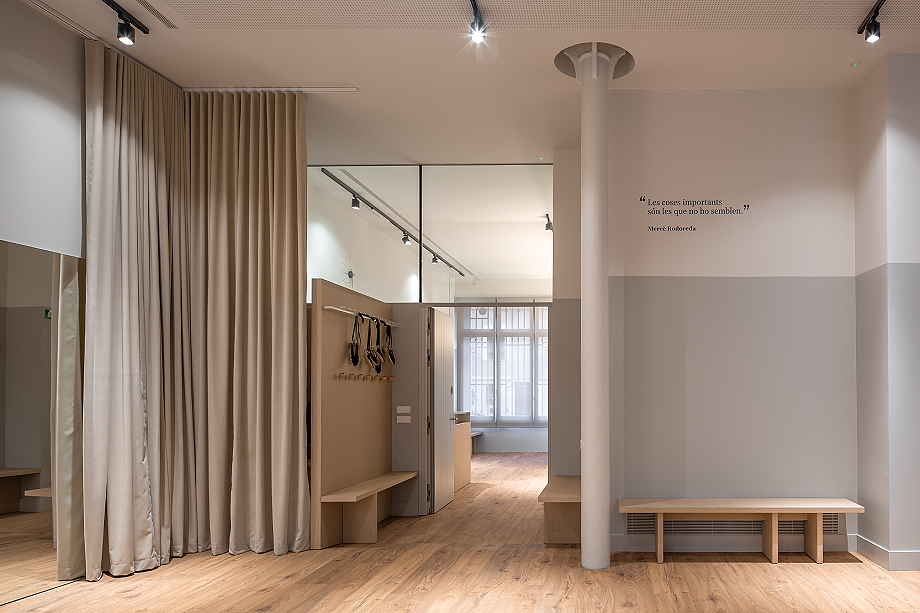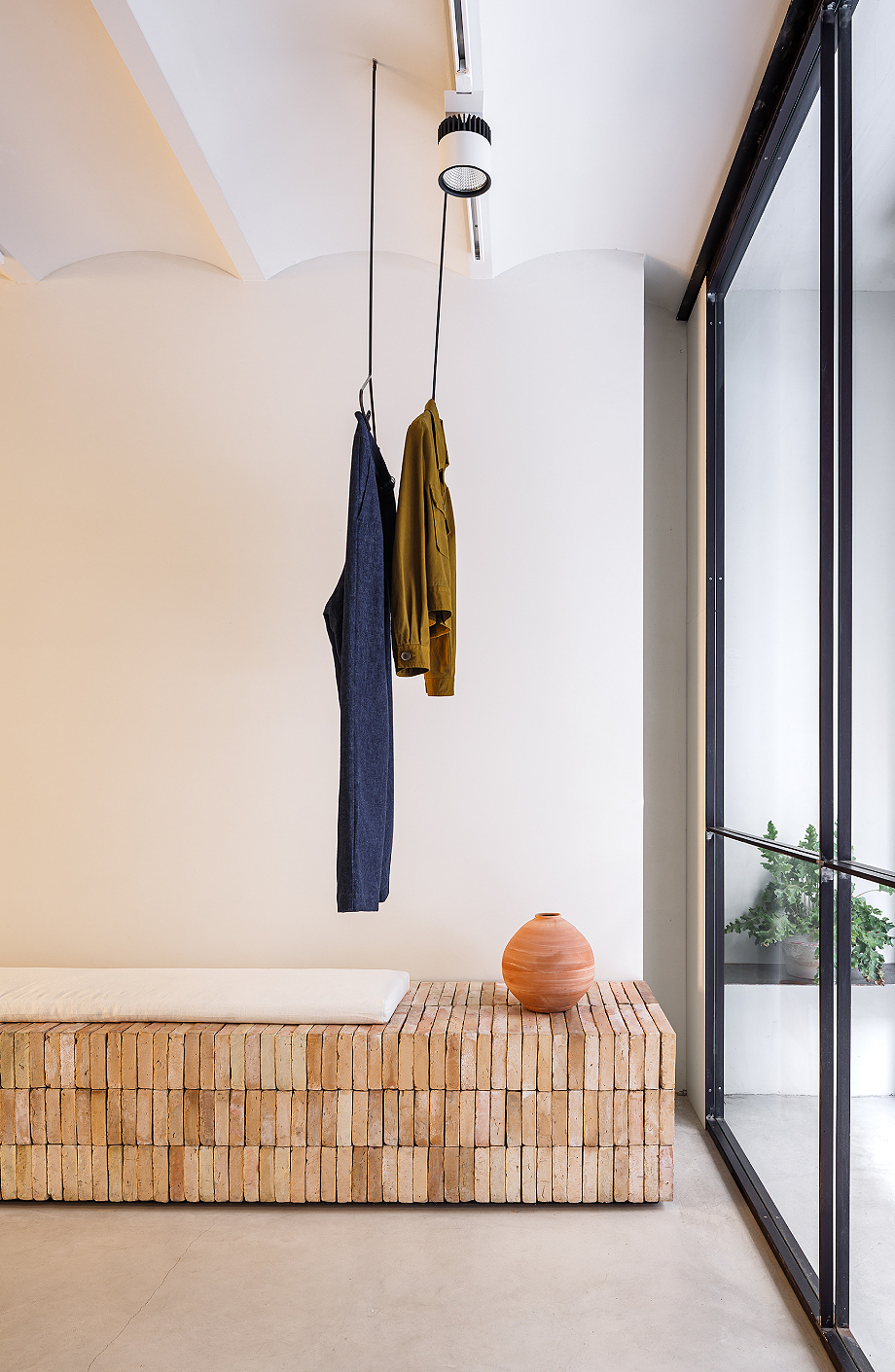 Proyecto de interiorismo y rehabilitación para Cus, estudio-taller de moda sostenible en el centro de Barcelona. Fotografía: Marc Torra (Fragments)