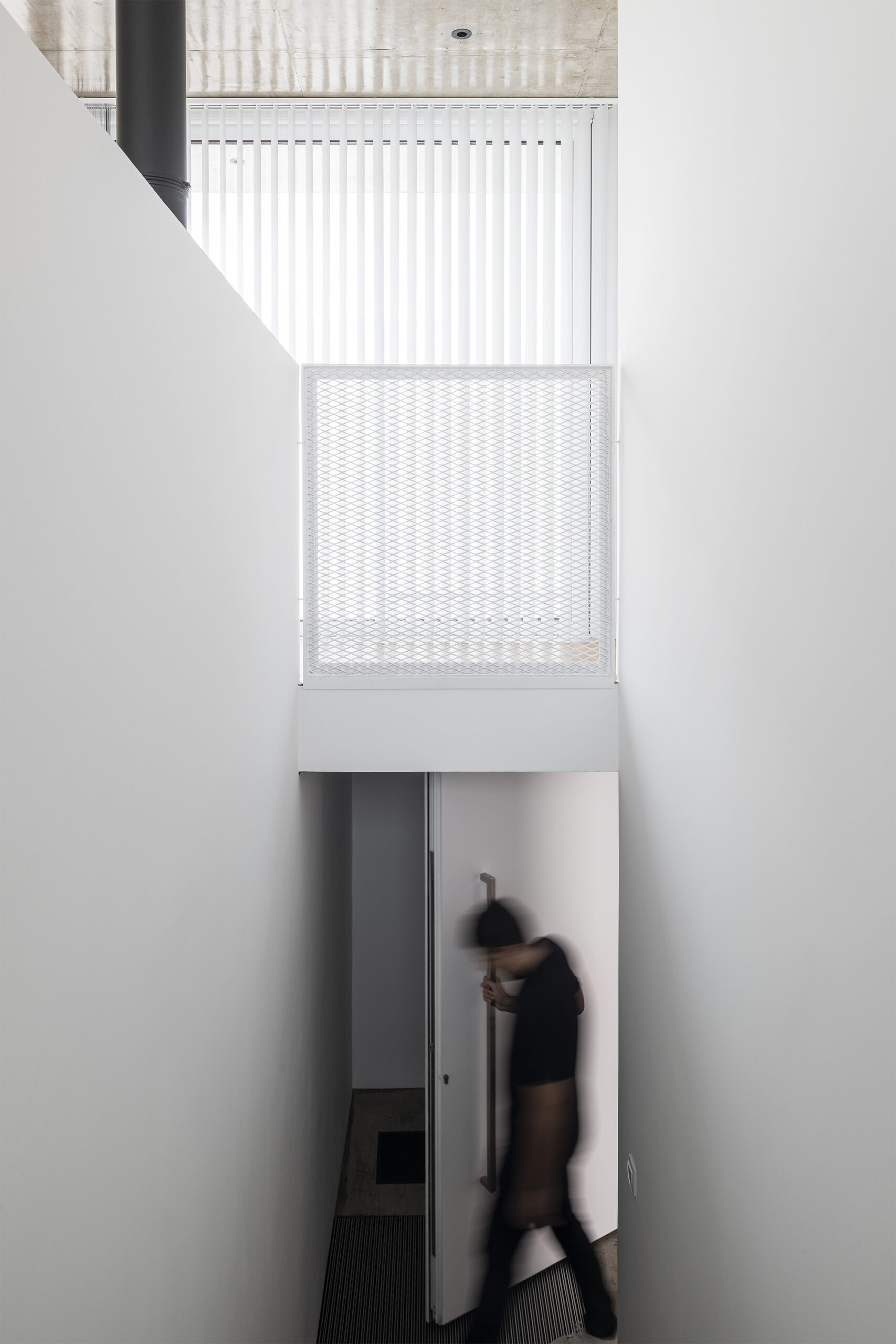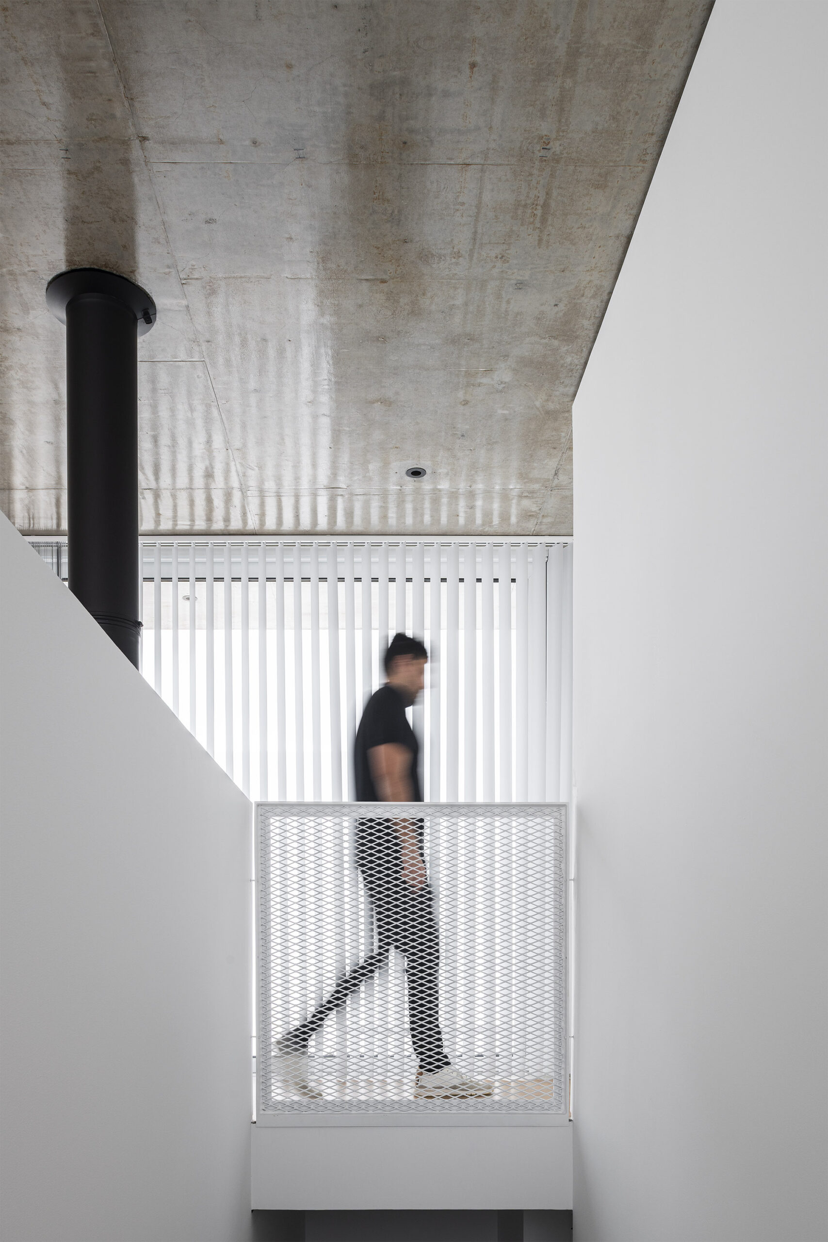Las barandillas metálicas de diseño oblicuo que conforman las fachadas fueron concebidas como elementos de seguridad y protección, pero también como filtros visuales que dotan de ritmo y ligereza al conjunto. El predominio del blanco en las superficies aporta una presencia luminosa y cohesionada dentro del paisaje urbano. Este tono, además de unificar los volúmenes y potenciar la claridad del conjunto, evoca los matices claros de los invernaderos de piña característicos de la zona, estableciendo un vínculo sutil con la identidad local.