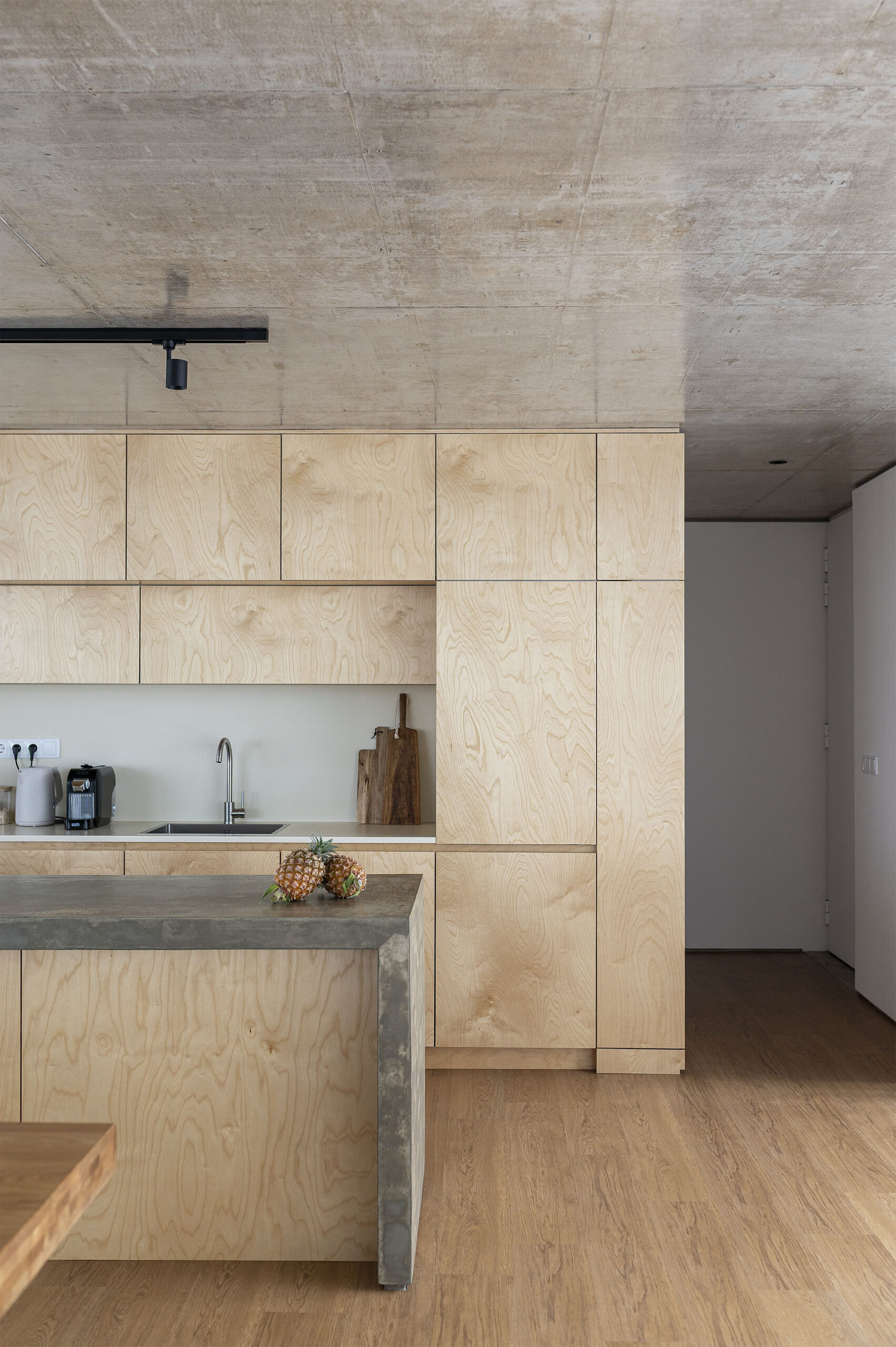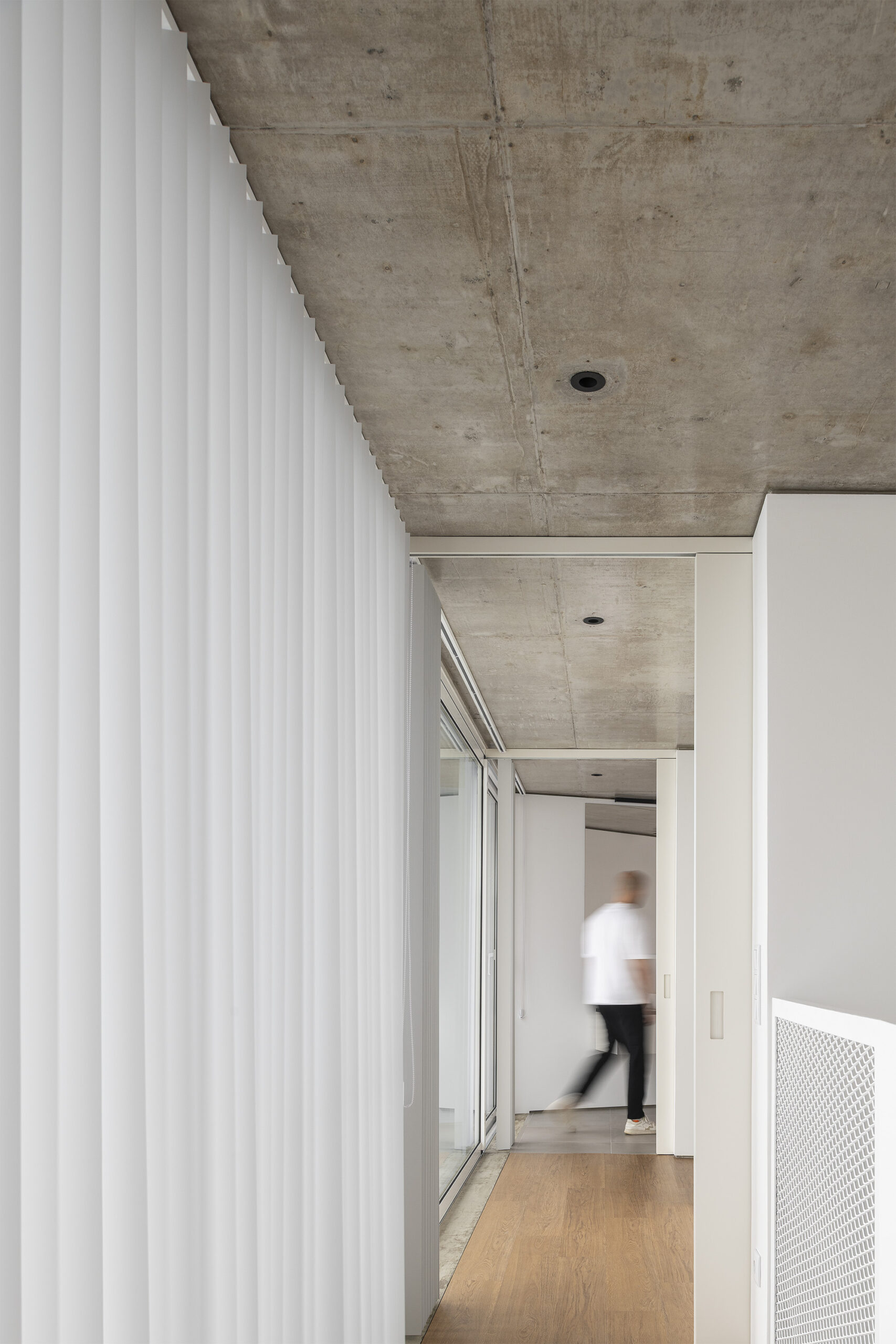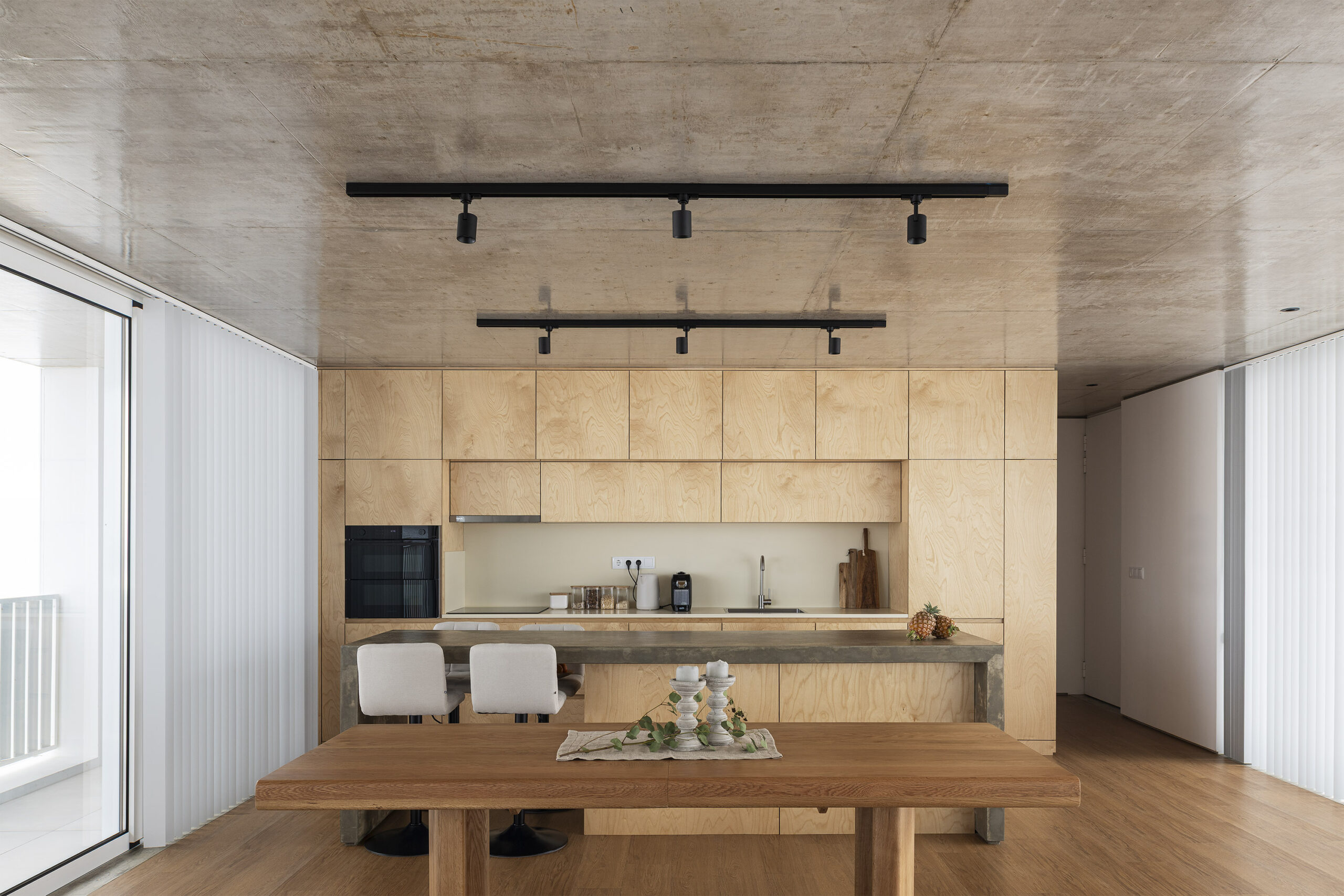 La planta baja acoge la principal zona de estar, compuesta por dos dormitorios -uno de ellos con baño privado-, un aseo de invitados, un salón, un comedor y una cocina abierta que conecta directamente con el exterior. Esta conexión favorece la continuidad espacial y potencia la relación directa con la terraza orientada al este, bordeada por una piscina exterior. El salón y las suites se abren tanto hacia el balcón occidental como el patio oriental, que ofrece refugio frente ruido urbano y vistas despejadas del mar.