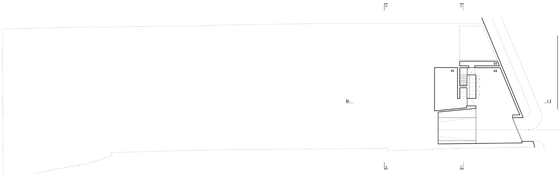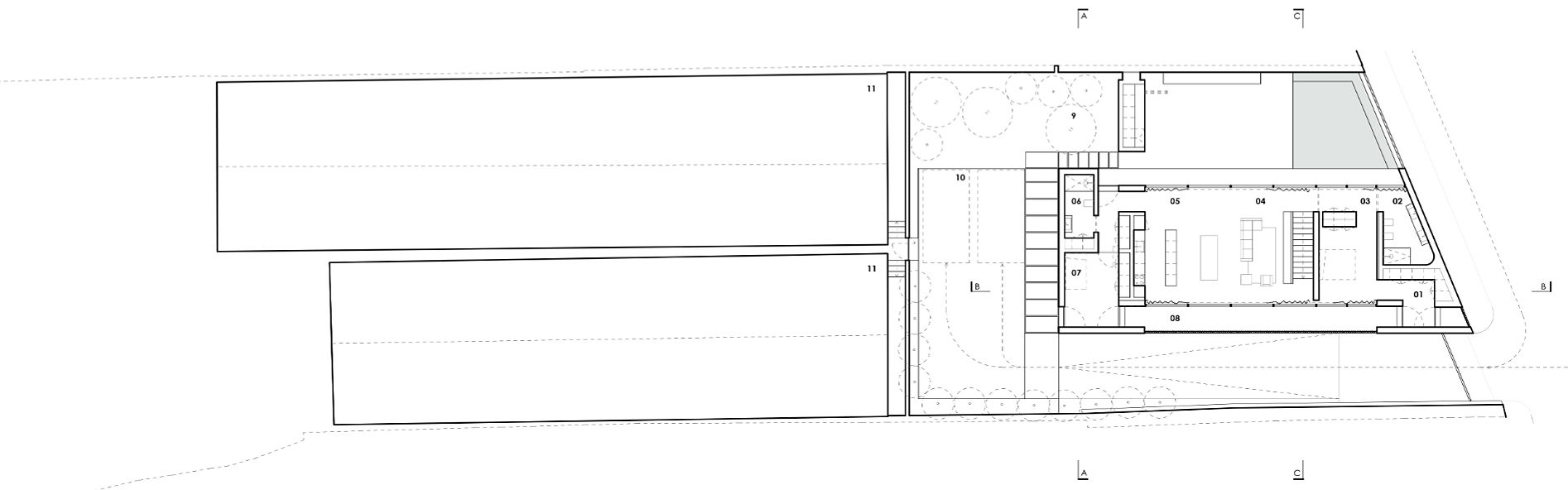 La Casa AC se articula en dos niveles adaptados a la pendiente natural del terreno. En la planta baja, semienterrada, se ubican el garaje con acceso directo a la vía pública, las áreas técnicas y de apoyo, y una entrada secundaria a la vivienda.