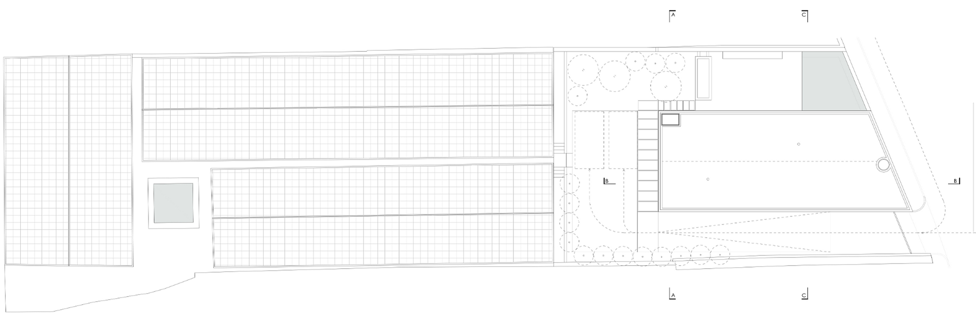 Por otra parte, la lectura limpia y continua de los volúmenes contrasta con la ligereza estructural y los planos inclinados de esos invernaderos, acentuando la diferencia entre el techo plano y sólido de la vivienda y las cubiertas ligeras y transparentes de las construcciones agrícolas. Asimismo, los pavimentos y revestimientos exteriores emplean materiales de bajo mantenimiento y tonos neutros, contribuyendo a la sobriedad general.