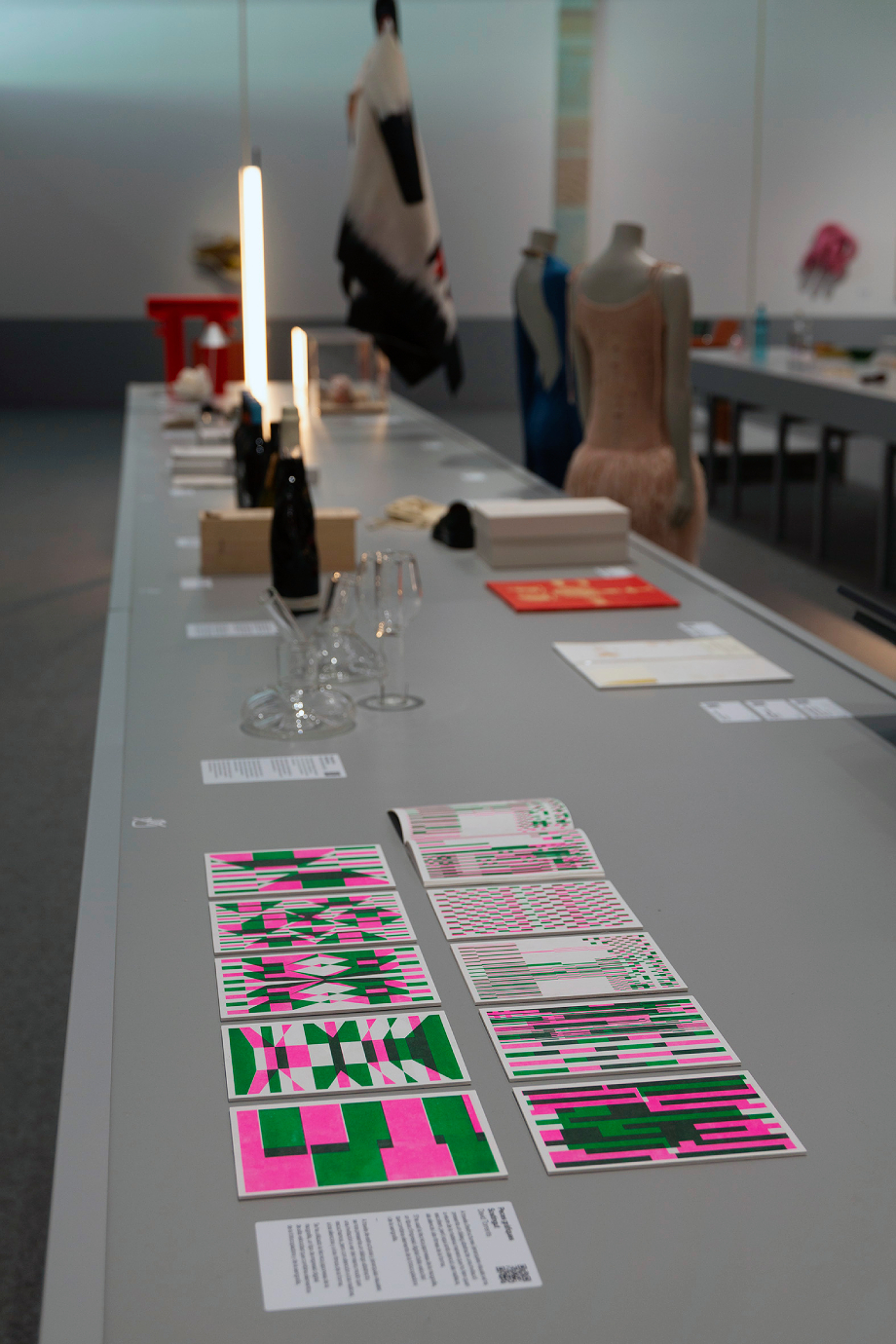 La exposición, con diseño expositivo del arquitecto Roger Badia Rafart y diseño gráfico de Clara Pessanha, está formada por tres bloques. En primer lugar, encontramos una introducción con la participación del FAD en la Exposición Internacional de las Artes Decorativas e Industriales Modernas de París de 1925, con fotografías y piezas de la muestra representativa de los artistas catalanes que organizó la entidad barcelonesa. A continuación, se accede a una gran sala donde se confrontan los objetos de los dos mundos, el de 1925 y el de 2025. En el punto medio, donde simbólicamente situaríamos el espejo, un letrero informa qué mitad corresponde a los elementos de los años veinte del siglo pasado y cuál a los contemporáneos. Los contenidos de las tablas se organizan de manera simétrica respecto a esta indicación, facilitando que el visitante siempre tenga por delante lo que está por venir y detrás lo que nos ha hecho llegar hasta aquí.