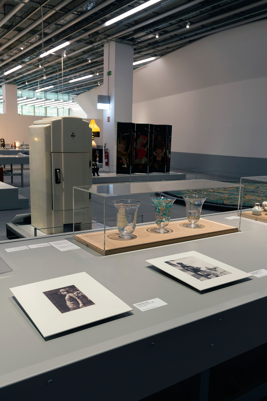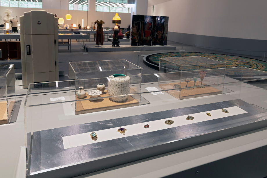 Entre las piezas expuestas destacan diversos objetos que ejemplifican estas cuatro líneas. En el hedonismo, sobresalen el vestido flapper de Gallart (1927), el colgante de aguamarina de Jaume Mercadé (1928) y el anuncio de faja de Josep Masana Fragas (1930), junto al jarro El paraíso perdido de Crespo y Nogués. El exotismo se refleja en la caja lacada de Enriqueta Pascual, los bocetos de joyas de Lluís Oms para Tórtola Valencia y el biombo La Creación (1925), de Francesc d’Assís Galí y Ramon Sarsanedes (1925). En el optimismo, destacan el anuncio Las Arenas de Josep Renau (1932) y el emblema del capó Cigüeña de la marca Hispano SuizaF. Bazin (1936). Finalmente, la democratización se ejemplifica con la cafetera eléctrica Eibar de Solac (1932) y la fotografía publicitaria de Josep Sala Campàs para la joyería J. Roca (1932).