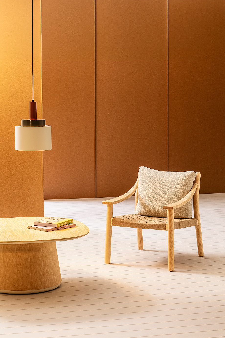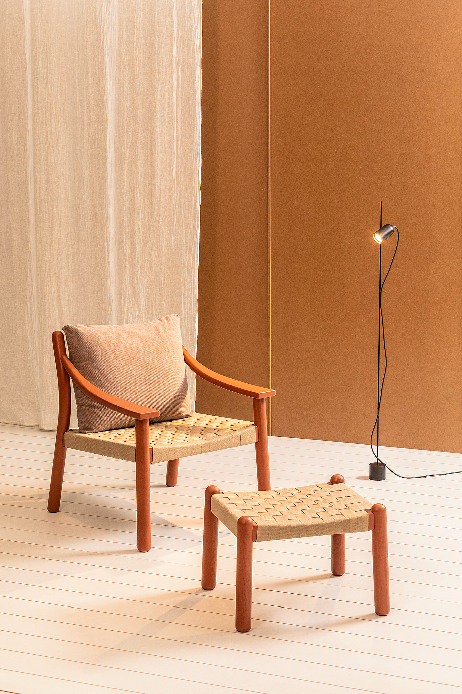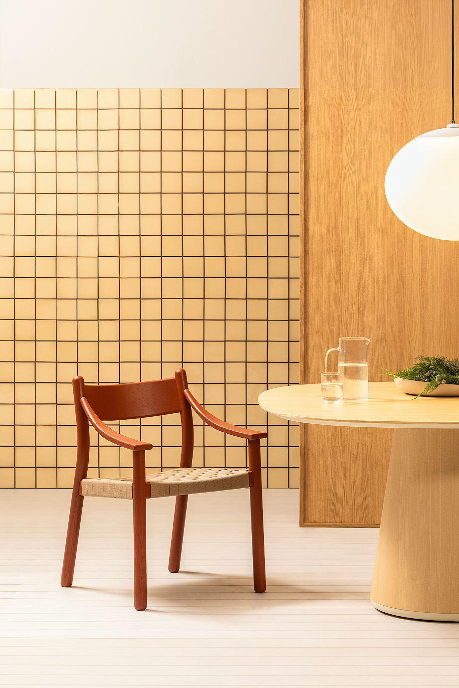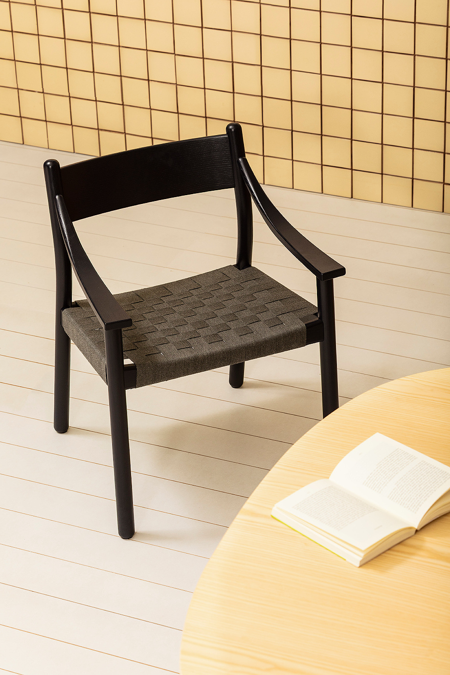 El asiento de cada modelo está tramado a mano con cinta textil sobre una estructura de madera maciza de fresno, disponible en acabado natural, teñido o lacado. La elección de materiales nobles y la ejecución artesanal garantizan una sentada confortable y duradera, coherente con la filosofía compartida por Lagranja y Vergés: crear productos honestos, funcionales y atemporales.