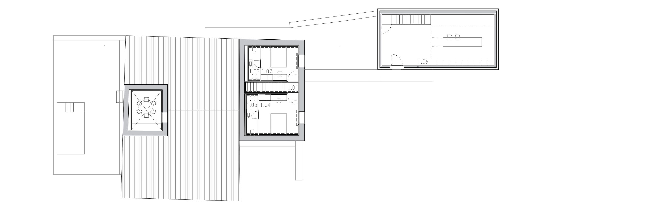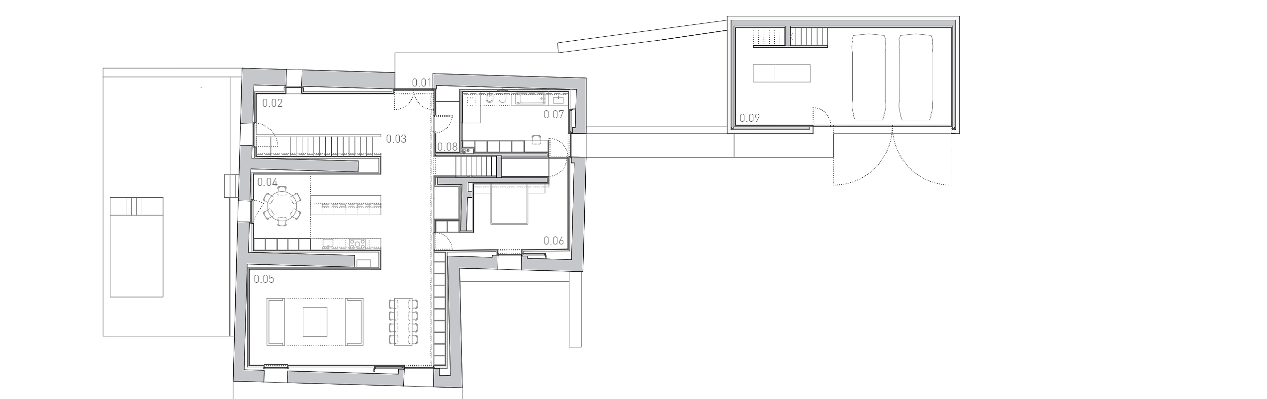 Este proyecto nació primero de comprender y después de intervenir únicamente donde era necesario. En la planta de acceso, se sitúa la cocina, que aprovecha la triple altura del antiguo torreón, y el salón, abierto hacia las vistas de la sierra. La planta superior acoge dos dormitorios, mientras que la planta inferior, que antiguamente albergaba animales, se convierte en una sala polivalente. El volumen adyacente, previamente destinado a labores agrícolas, ahora funciona como garaje y, en su planta superior, como estudio desde donde Woodgate dirige su trabajo.
