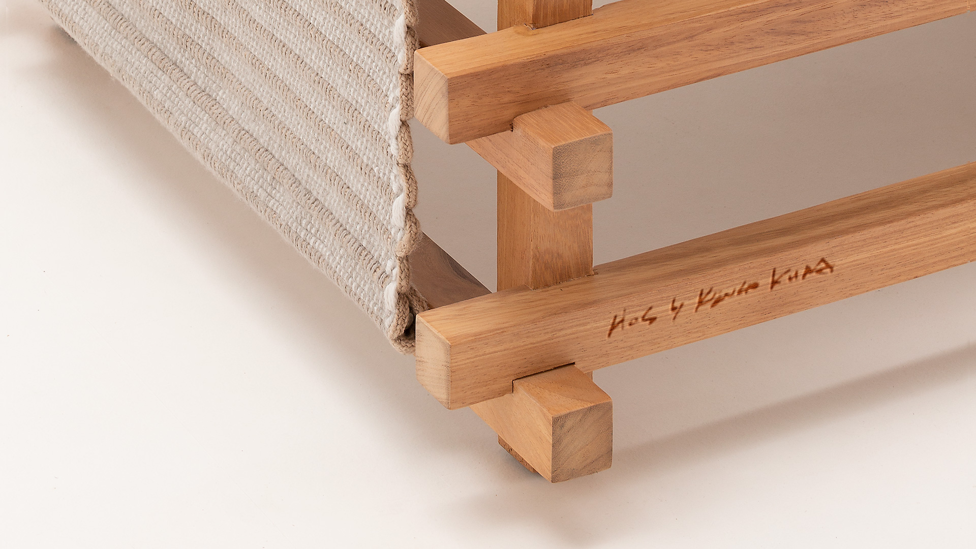 En este contexto, se enmarca la colección HOS, concebida por el arquitecto japonés Kengo Kuma. La propuesta sintetiza los valores fundacionales de la nueva EDITION y supone una integración entre investigación tecnológica y sensibilidad artesanal. Para ello, Kuma ha trabajado con artesanos de la India que colaboran con GAN en la creación de tejidos a partir de fibras de PET reciclado. Los textiles resultantes, con consistencia de alfombra, funcionan como membranas que envuelven estructuras de madera de iroko, desarrolladas con el saber hacer de GANDIABLASCO y que transmiten la esencia de la tradición constructiva japonesa.