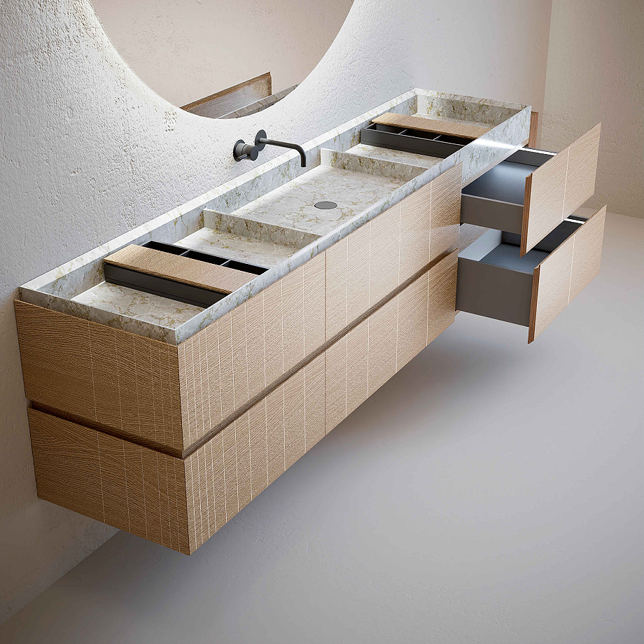 El protagonismo de la colección recae en la encimera, disponible en piedra natural o Solid Surface: una superficie ingleteada que se integra de forma continua en el interior del mueble, fusionándose con su estructura y eliminando cualquier borde visible. Este gesto constructivo da lugar a un volumen monolítico y elegante, donde la pureza formal refuerza la sensación de orden y armonía.
