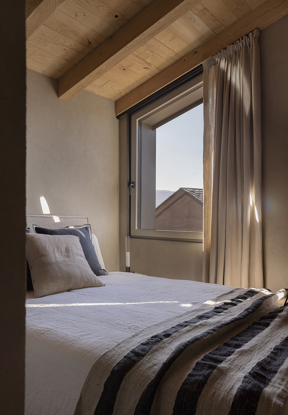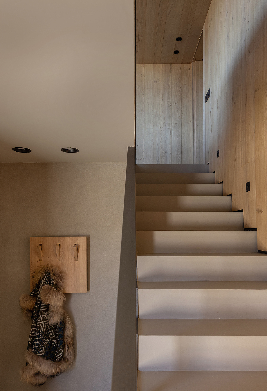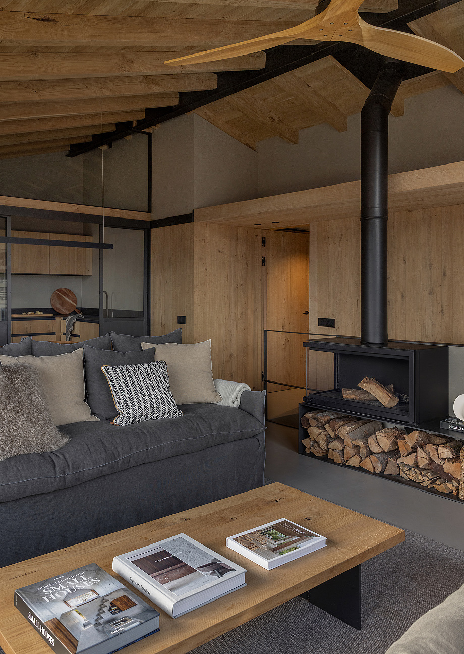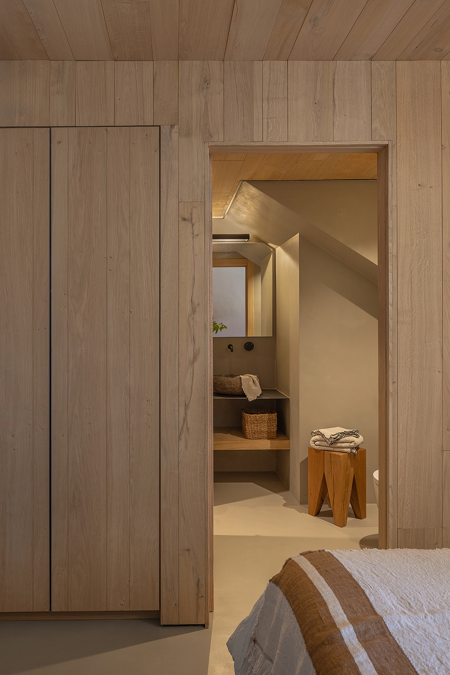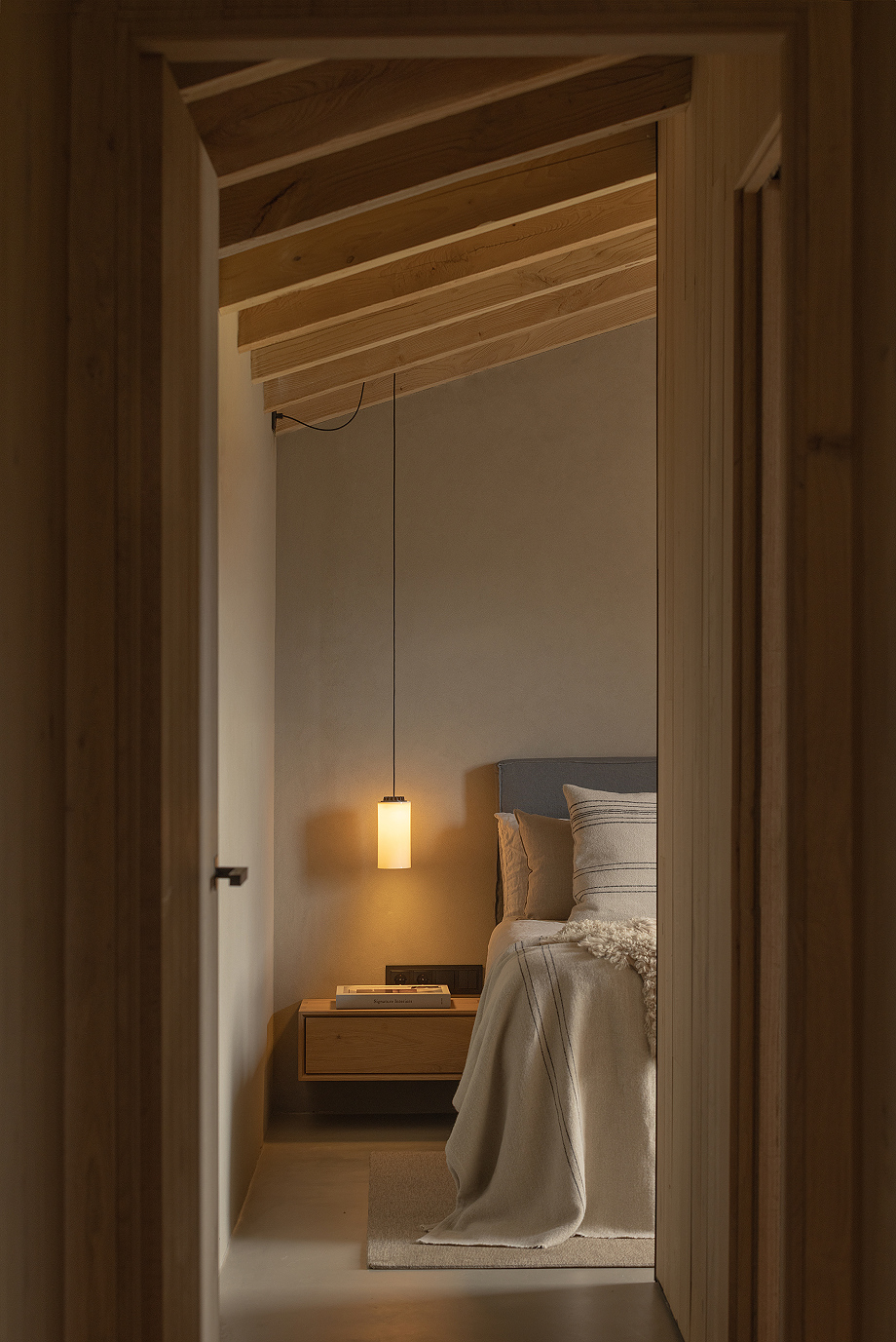 En la planta superior, el acceso principal conduce directamente al corazón de la casa: un gran espacio abierto que reúne salón, comedor y cocina. La comunicación entre estas zonas es fluida, pero se articula mediante transiciones sutiles que mantienen cada ambiente definido. La carpintería interior, realizada a medida por un artesano local, optimiza cada rincón. Destacan el armario suspendido bajo la escalera, integrado en la librería del salón, y la mesa de centro también diseñada a medida, con una altura especial para adaptarse a la costumbre familiar de cenar frente al televisor.