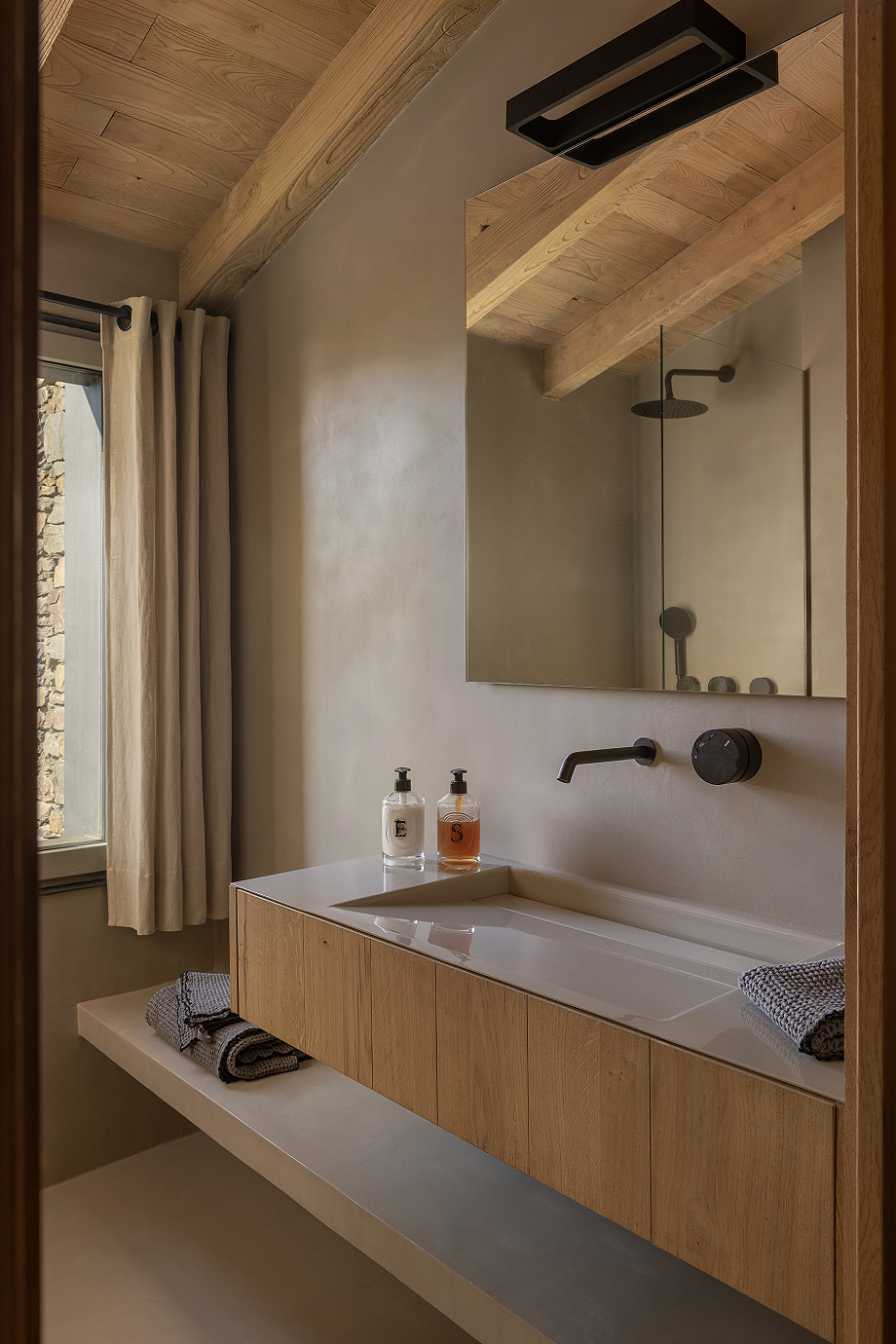En los baños, la funcionalidad y la coherencia estética siguen siendo claves. Destaca el mueble del baño principal, suspendido y diseñado a medida en roble natural, con lavabo integrado y líneas limpias que capturan el espíritu de la vivienda.