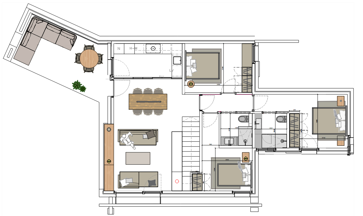 La distribución interior responde a las necesidades de una pareja joven con tres hijos adolescentes. Cuatro dormitorios dobles, estancias amplias y un generoso porche exterior definen un programa funcional sin pasillos innecesarios, donde cada metro ha sido planificado para disfrutar tanto de la tranquilidad del lugar como del encuentro con amigos y familiares.