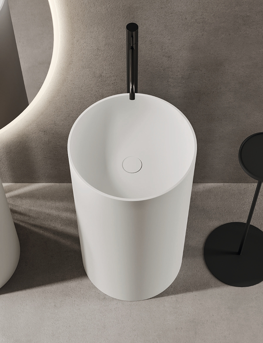 Fabricado en la superficie sólida Cristalplant, Tube ofrece resistencia, continuidad en las formas y acabado uniforme. La versión más pura presenta un acabado blanco mate integral (interior y exterior), que resalta la claridad y simplicidad de su diseño. Para una personalización más amplia, Tube puede lacarse en una amplia gama de colores mate, aplicables únicamente en el exterior o, en ciertas variantes, también en el interior. Entre estos colores se encuentran Riso, Nuvola, Luna, Sabbia, Argilla, Castoro, Creta, Ametista, Rosso Bollo, Caffè, Ambra, Senape, Giada, Tabacco, Salvia, Agata, Pietra, Origano, Bosco, Fango, Grafite, Zaffiro, Neve y Nero. Además, la colección también incluye acabados metálicos -Platino, Zinco, Quarzo, Basalto, Ambra y Titanio- y la serie Sillmatt, con Greige, Seta, Tortora, Lavica y Antracite.