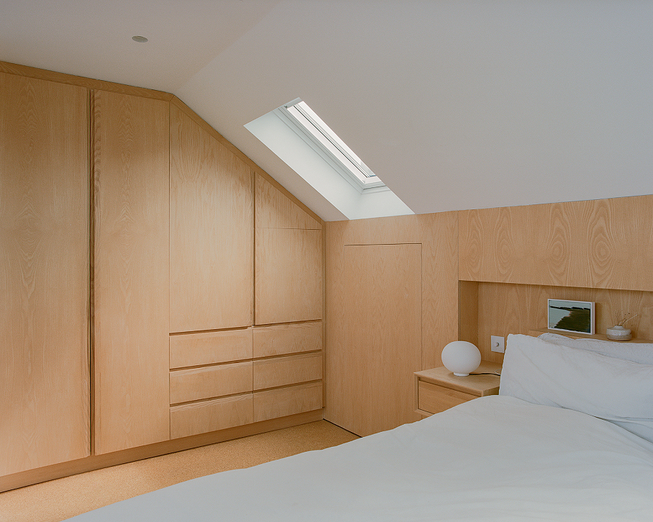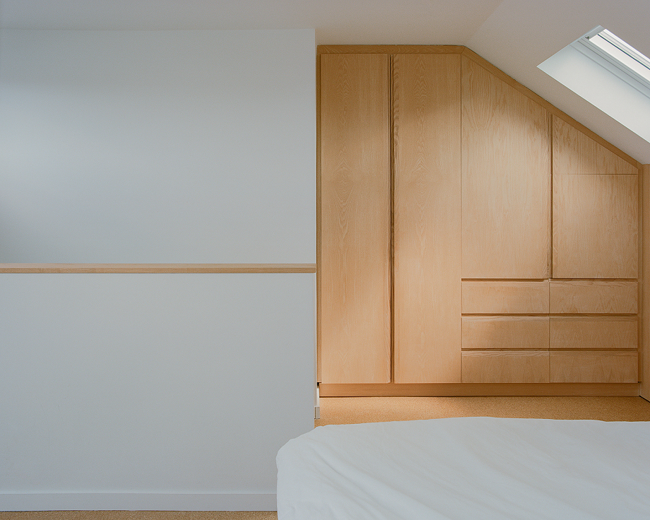 Sobre el volumen principal, la conversión de una buhardilla amplía significativamente la superficie habitable e incorpora un dormitorio, un baño compartido y un despacho. El objetivo fue evitar la percepción de confinamiento habitual en este tipo de intervenciones. Así, el nuevo dormitorio se abre mediante un gran ventanal panorámico vertical que encuadra la ciudad y el cielo, generando la sensación de estar en un mirador privado. En el baño, otra claraboya amplifica la luz natural, reforzando la experiencia de verticalidad y apertura, creando la sensación de estar al aire libre.