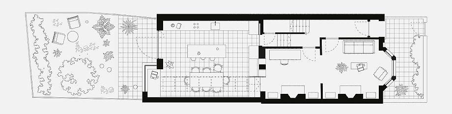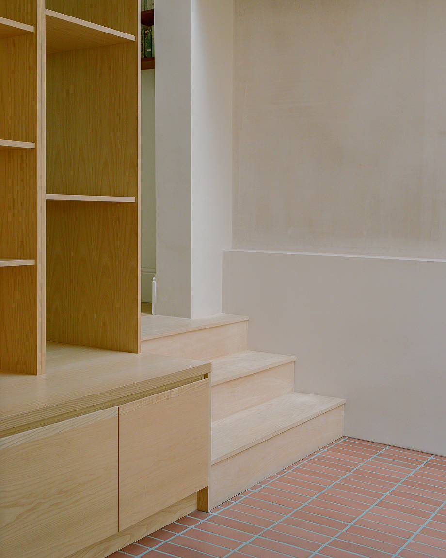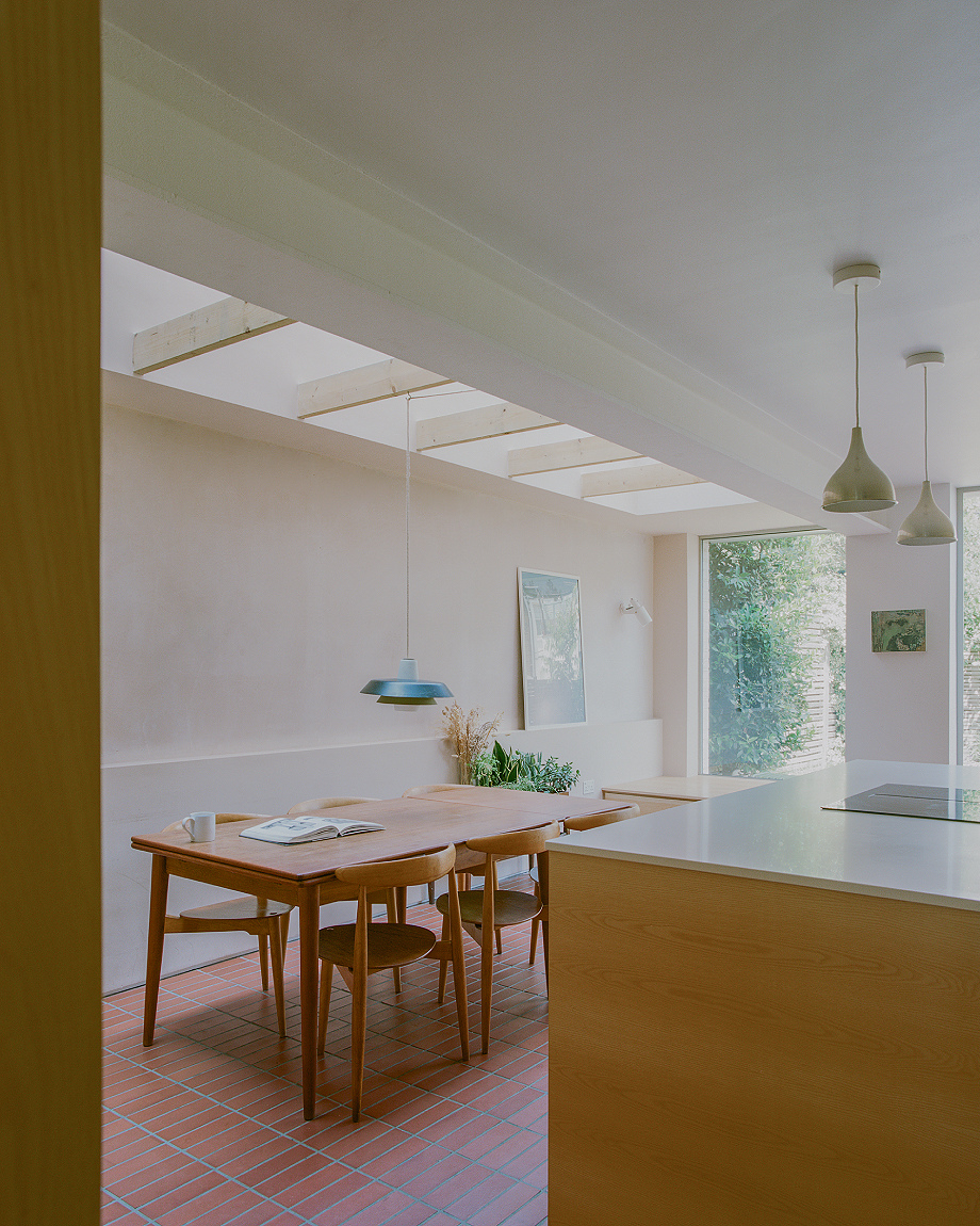 La intervención se articula en dos frentes. En la planta baja, la antigua cocina -reducida, oscura y aislada del jardín- se transformó por completo. TYPE Studio introdujo un nuevo espacio de cocina y comedor definido por una relación directa con el exterior. La incorporación de una ventana esquinera sin marco, un banco integrado y una puerta pivotante de gran formato abre el interior hacia el jardín renovado, disolviendo el umbral entre ambas áreas. Una generosa claraboya situada sobre el comedor actúa como hito luminoso: permite que la luz penetre profundamente en la planta existente y establece una transición clara entre lo nuevo y lo preexistente, subrayada por un desnivel y estanterías abiertas.