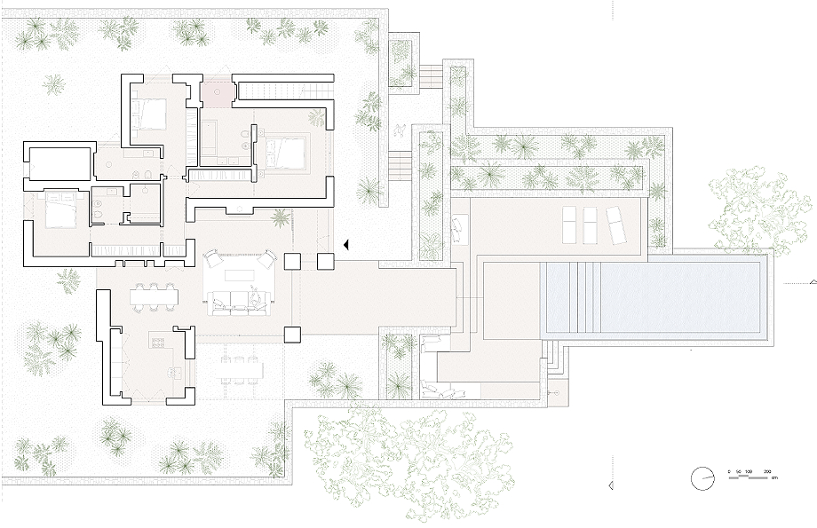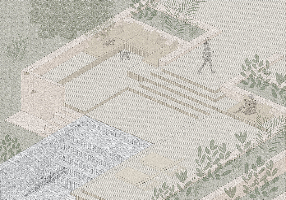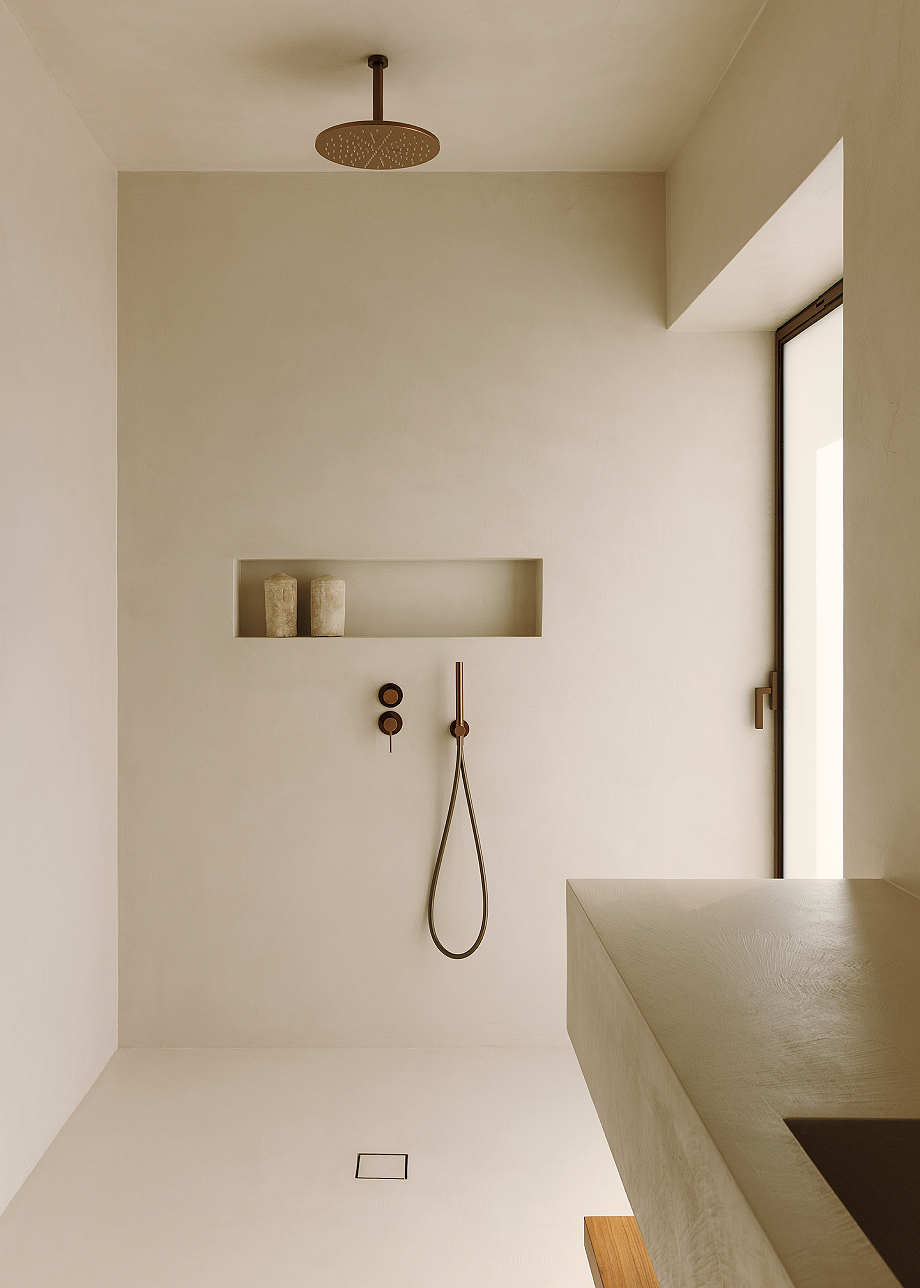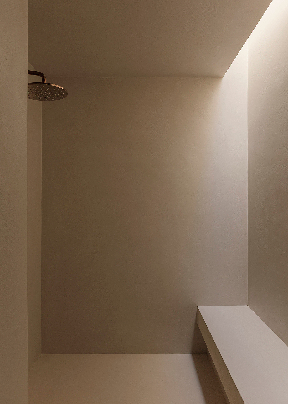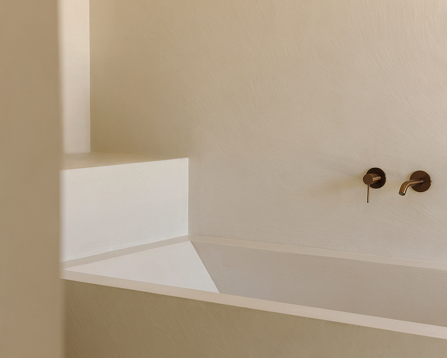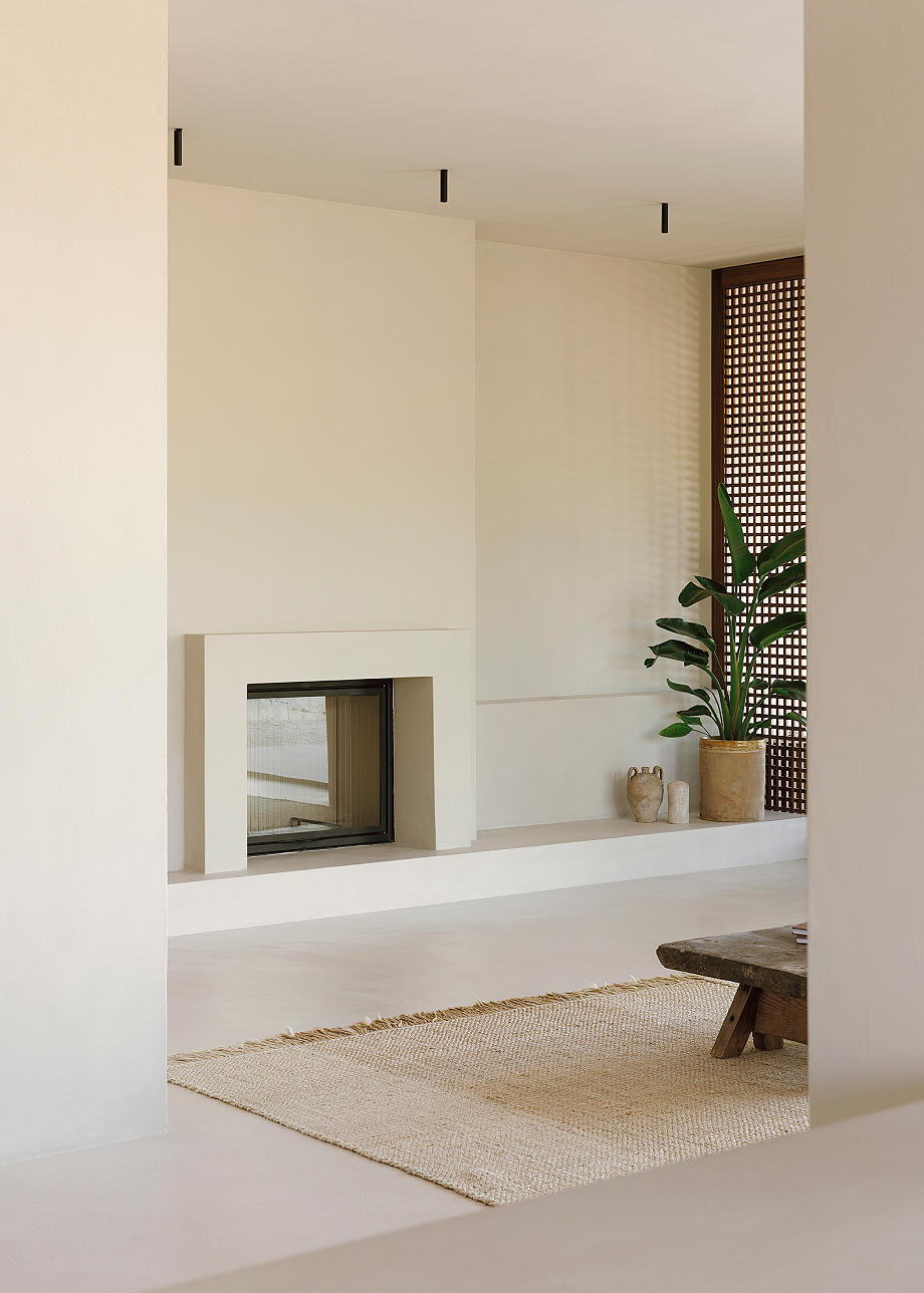 El proyecto define su identidad mediante un diálogo constante entre arquitectura y entorno. Grandes ventanales integran interior y exterior, mientras que el revoco de cal natural y el microcemento color arena crean una piel continua y táctil. Las superficies se transforman en escalones, bancos y mobiliario empotrado, uniendo funcionalidad y diseño. Por ejemplo, la escalera que conduce a la piscina sirve también como asiento para el salón exterior, la chimenea emerge de la pared de la sala de estar y la cama principal se eleva del suelo en continuidad con el espacio.