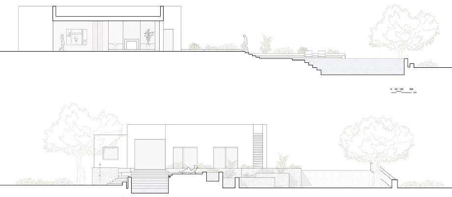 En el exterior, la casa se inserta en la topografía mediante muros de piedra seca local. Estas terrazas estratificadas guían el recorrido, articulando el acceso con rampas y escalones, mientras la vegetación mediterránea envuelve el perímetro con tonos verdes y grises. En el límite del terreno, una piscina infinita revestida de microcemento antracita se funde visualmente con el mar Adriático, reflejando los tonos naturales del entorno y consolidando la conexión entre arquitectura mediterránea y paisaje.