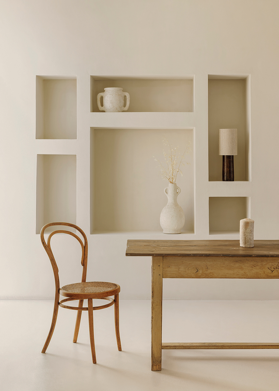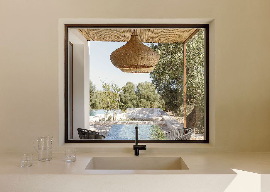 Si la materialidad define los espacios, la luz natural los completa. La luz del norte se distribuye suavemente por las paredes pálidas, mientras que la del este aporta tonos cálidos por la mañana. Los marcos de hierro de las ventanas generan líneas delicadas en color marrón que enmarcan los olivos centenarios. Dentro de esta geometría serena, las puertas y la carpintería de nogal aportan calidez y textura, creando un vocabulario táctil y visual que conecta al visitante con la arquitectura mediterránea de Ostuni.