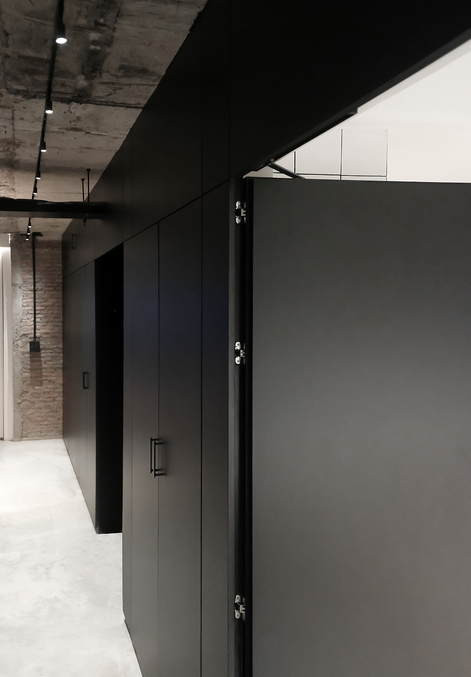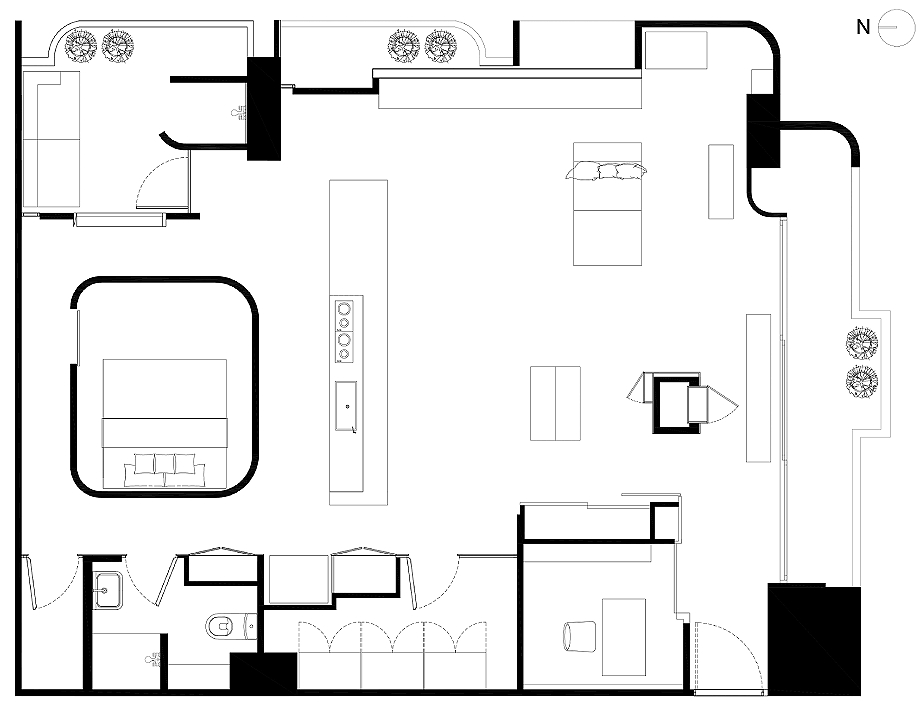 La vivienda se articula en torno a la zona de día, concebida como un espacio abierto que ocupa la mayor parte del centro de la planta. En esta estancia, la cocina renovada -con una escultural isla de madera- y el mobiliario empotrado actualizan el conjunto sin borrar su vínculo con el pasado. Tras una pared de armarios negros, que también da servicio a la cocina, se ocultan un área de almacenaje, el baño y el estudio, resolviendo el programa de manera compacta y funcional.