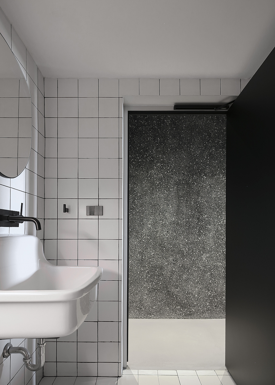 En el espacio principal de la vivienda, la estructura de hormigón se dejó vista, mientras que el cemento lavado con arena se ha utilizado para establecer una conexión visual y táctil con la arquitectura existente. Su capacidad para moldearse y su fuerte identidad material aportan una dimensión adicional al diseño interior, y permiten crear una continuidad entre los espacios interiores y exteriores. Este enfoque pone de manifiesto cómo el uso de materiales sencillos y discretos puede aportar durabilidad y versatilidad al proyecto.