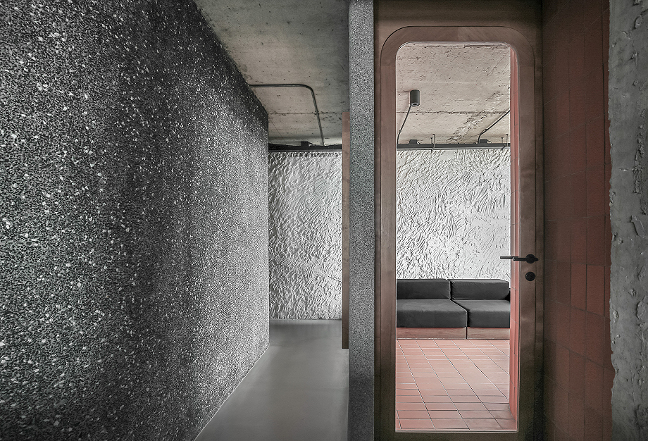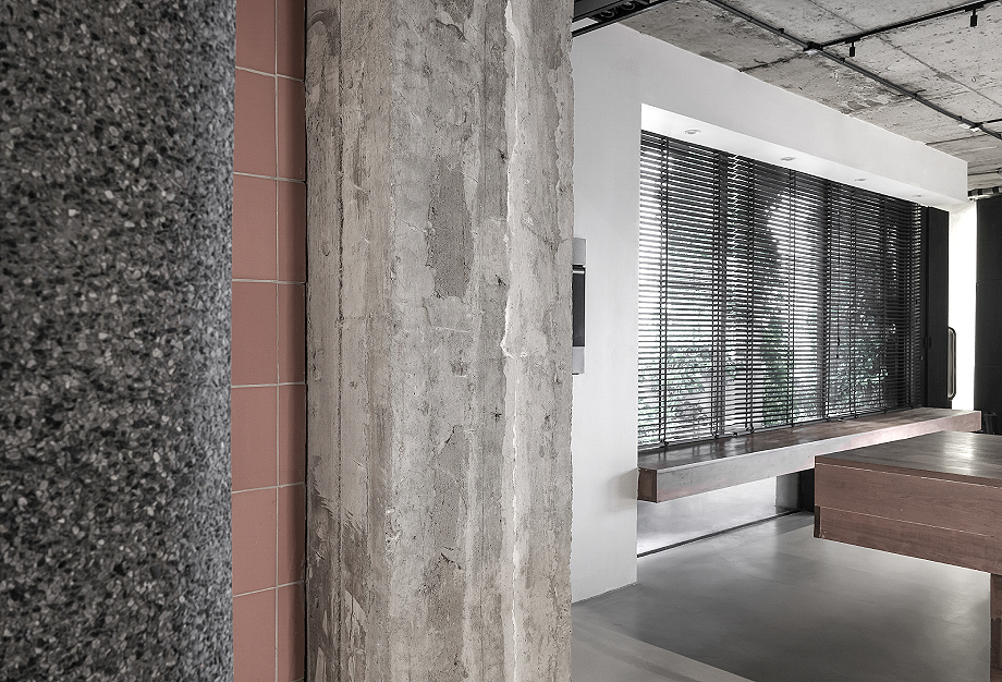 Explica el despacho, dirigido por Udomsak Komonvilas, Jariyawadee Lekawatana y Luke Yeung, que el cemento lavado con arena es una mezcla de piedra, grava y cemento que, por lo general, se combina directamente en la obra. Una vez aplicado, su capa exterior se “lava” para revelar los patrones de la piedra y generar un acabado texturizado. Tradicionalmente, este material se utilizaba en suelos y paredes exteriores de casas, escuelas y templos en Tailandia, pero con el tiempo pasó a considerarse discreto y anticuado. Sin embargo, su extendido uso en décadas anteriores explica que aún hoy pueda encontrarse en zonas públicas y edificios deteriorados de Bangkok.