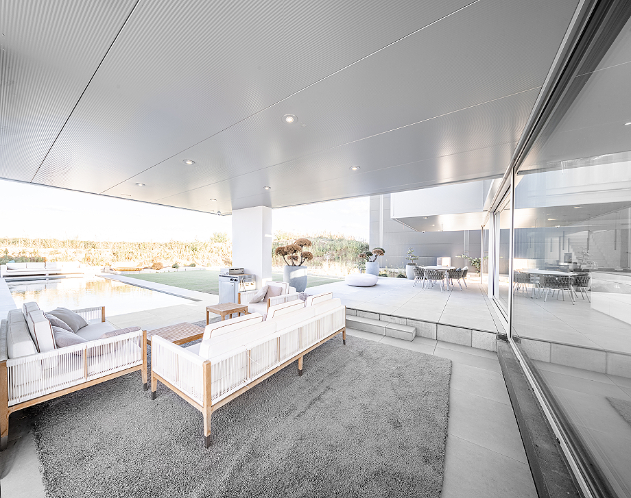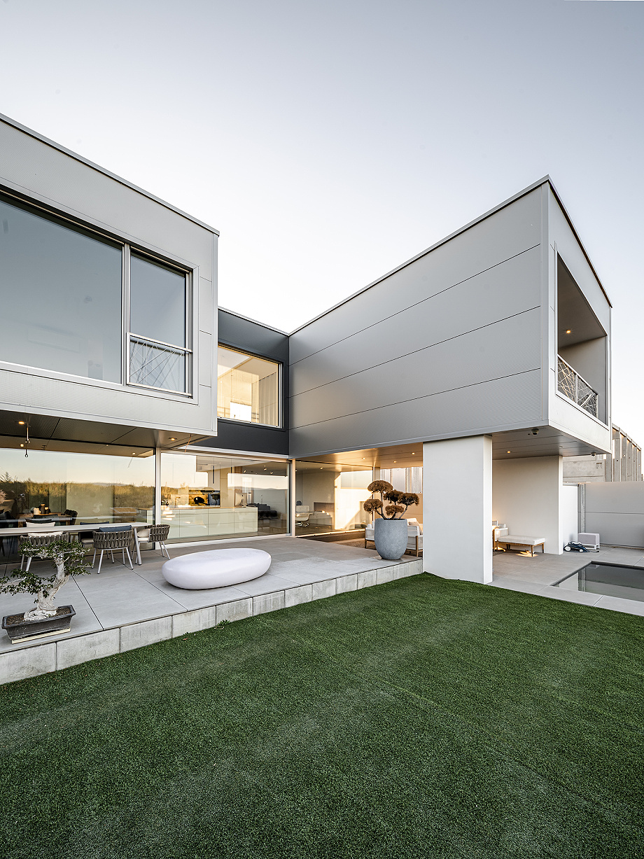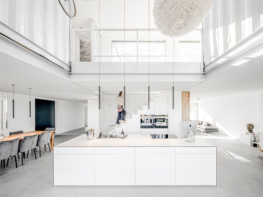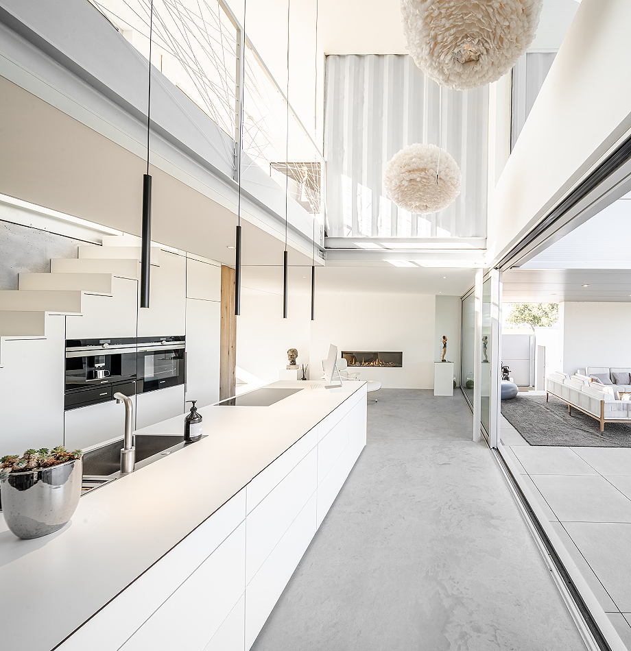 El interior se caracteriza por una reducción máxima de los elementos. Perfiles estrechos, juntas cuidadosamente alineadas y ángulos precisos se fusionan con la estructura de acero parcialmente visible y los contenedores escalonados. Paredes, techos y equipamientos en blanco dialogan con pavimentos claros y mobiliario de diseño, creando ambientes serenos y luminosos. Además, las grandes fachadas acristaladas permiten que la luz natural inunde cada rincón, reforzando la sensación de amplitud y la relación constante con el exterior. Todo responde a una lógica de coherencia formal y constructiva, donde cada detalle está pensado para acompañar el concepto global de la edificación.