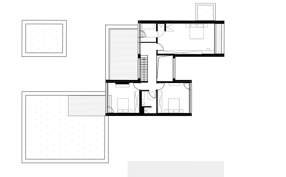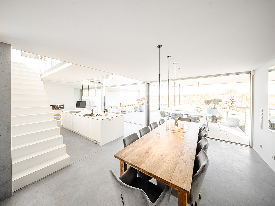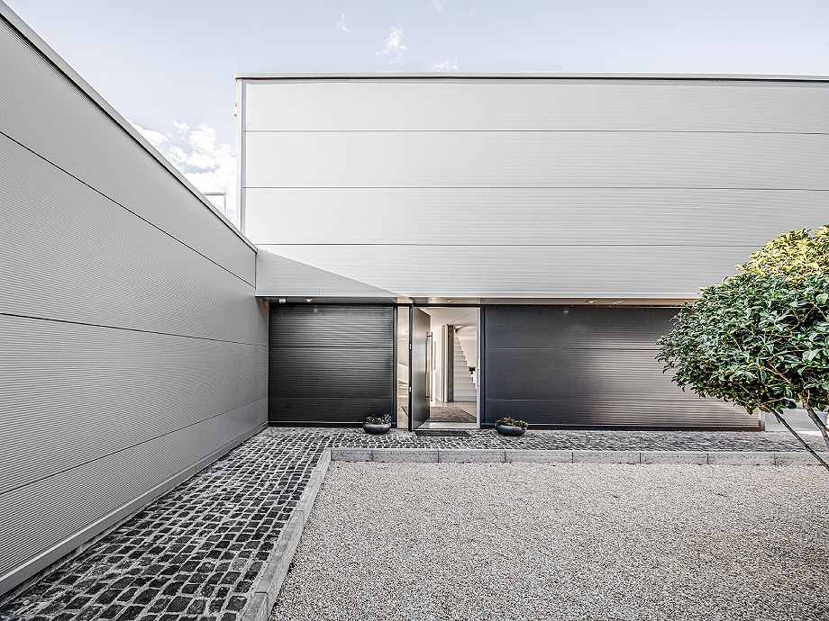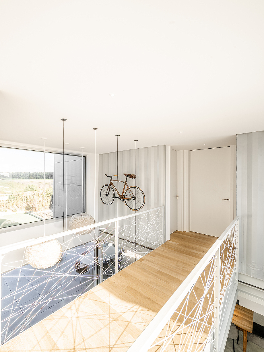 La vivienda, ubicada en el límite de una zona comercial, se integra con naturalidad en la trama de las estructuras vecinas, mientras se orienta hacia un entorno formado por parcelas ajardinadas, campos agrícolas y el bosque adyacente. La cuidadosa disposición de los volúmenes permite que la casa se abra hacia el paisaje verde mientras se protege del entorno construido. Esta configuración genera dos patios interiores y un jardín privado. La gran luz de las vigas de acero ha hecho posible una fachada acristalada de 12 metros de ancho, que refuerza la continuidad visual entre interior y exterior y potencia la sensación de amplitud.