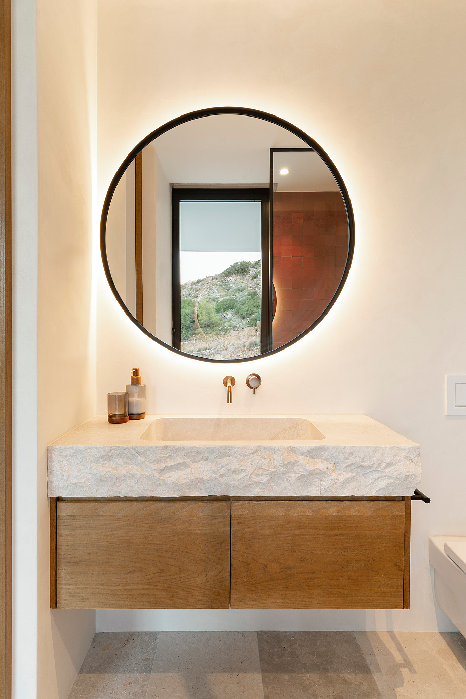 La materialidad desempeña un papel clave en esta búsqueda de equilibrio. Piedra de mampostería en la misma tonalidad que el terreno circundante, madera, celosías de barro cocido y revocos a la cal remiten a una arquitectura mediterránea fiel a la tradición, al tiempo que permiten una lectura contemporánea del conjunto.