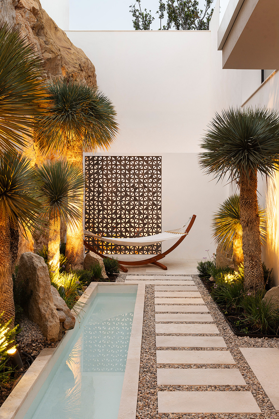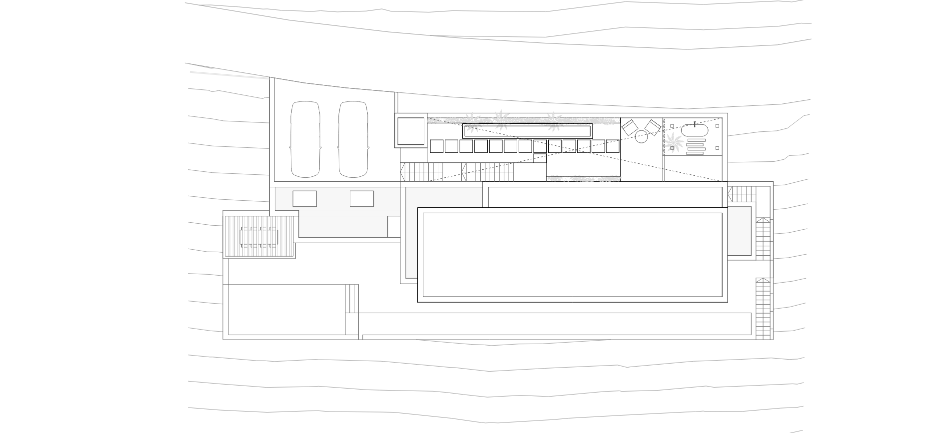 Los exteriores están concebidos como una prolongación natural de la casa. Terrazas de piedra, volúmenes encalados y vegetación autóctona se integran con la ladera, suavizando la geometría del conjunto. Los patios sombreados y los espacios intermedios facilitan una relación fluida entre interior y exterior. Desde prácticamente cualquier punto de la vivienda, se percibe la presencia de la piscina infinita, prolongada por un canal de nado de casi 25 metros de longitud que parece volar sobre la ladera. Este elemento se apodera de las visuales, desdibujando los límites entre arquitectura, paisaje y horizonte, y reforzando la sensación de serenidad mediterránea.